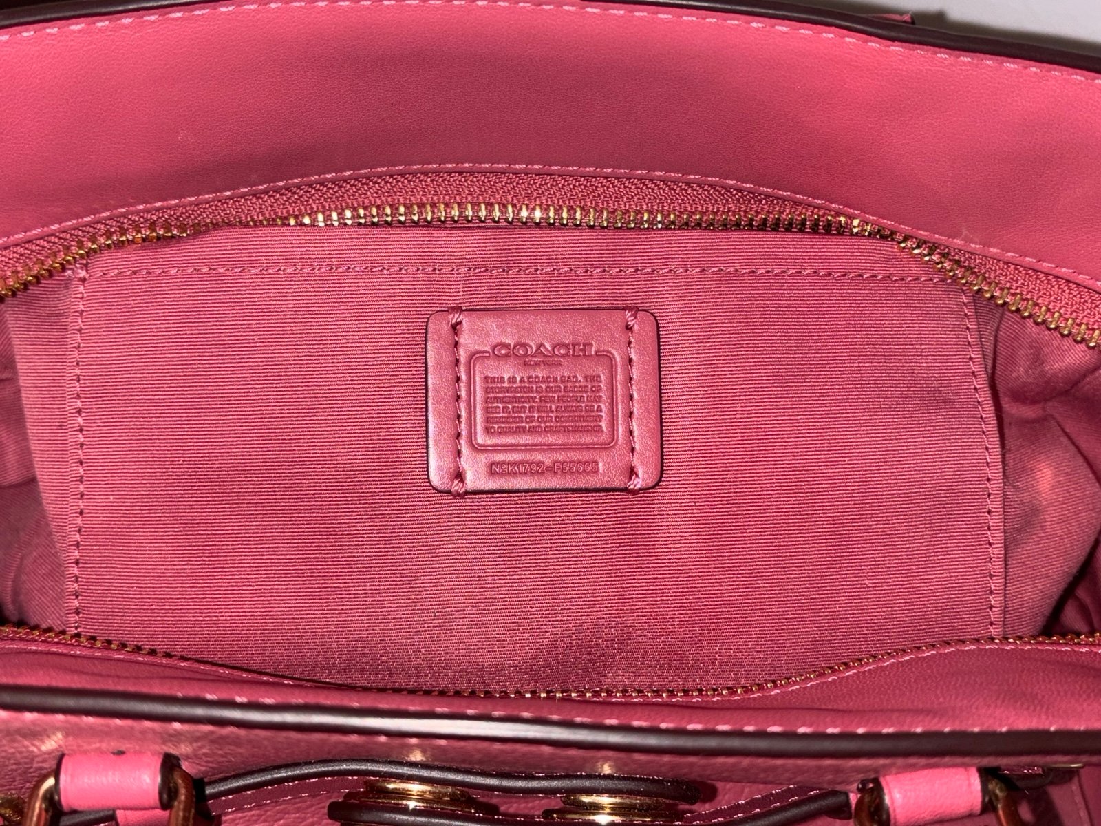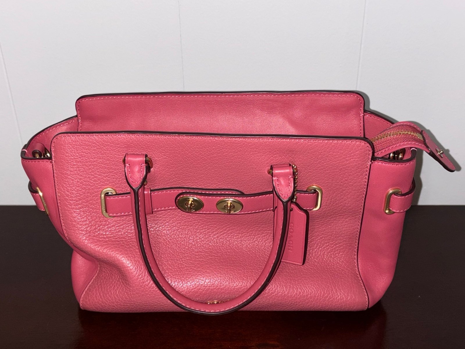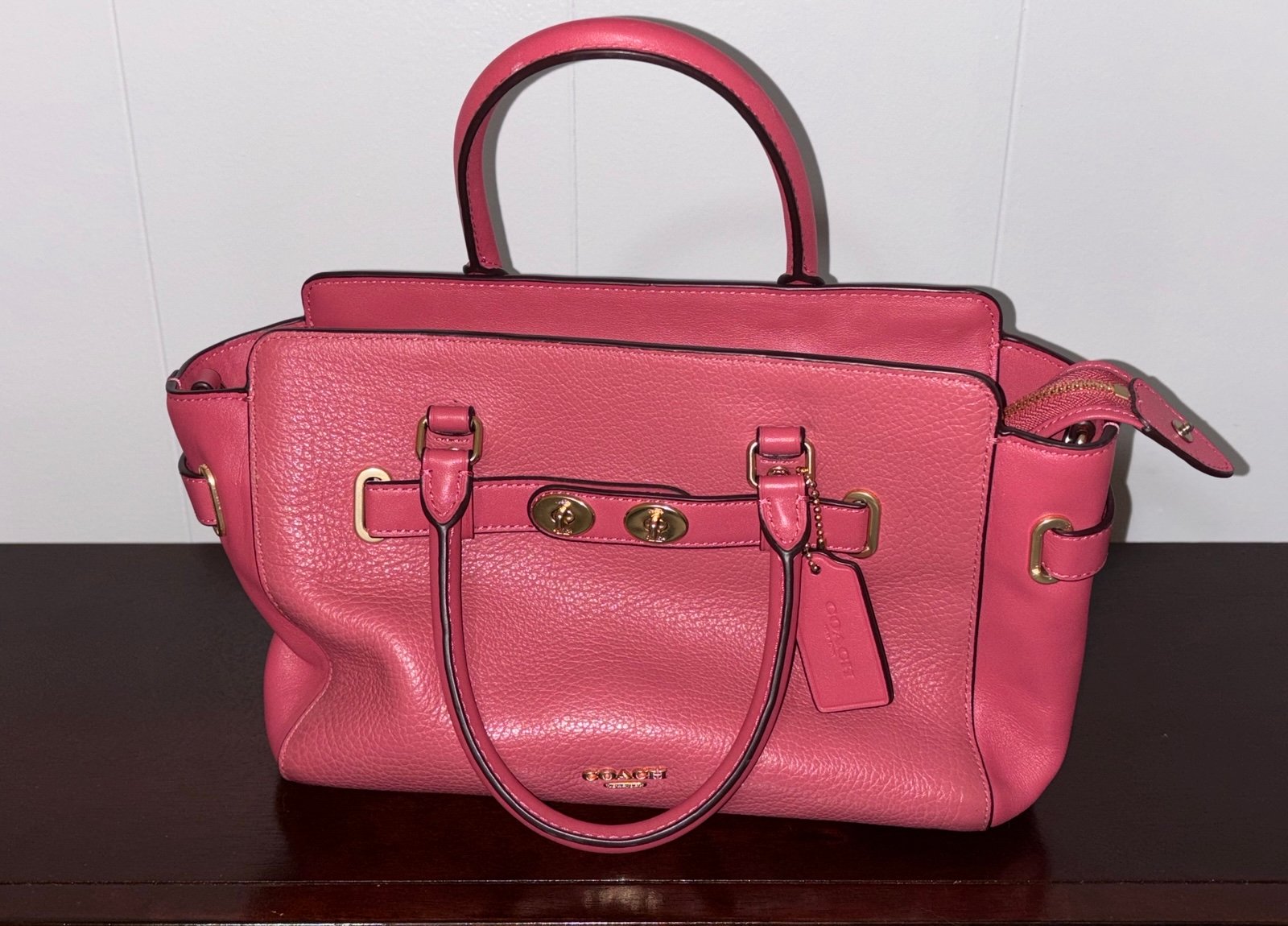 Elevate your style with the Coach Blake 25 Carryall handbag in a striking pink/rouge color. Made from high-quality leather, this bag showcases a secure zip closure and elegant gold hardware accents, complemented by a charming bag charm.