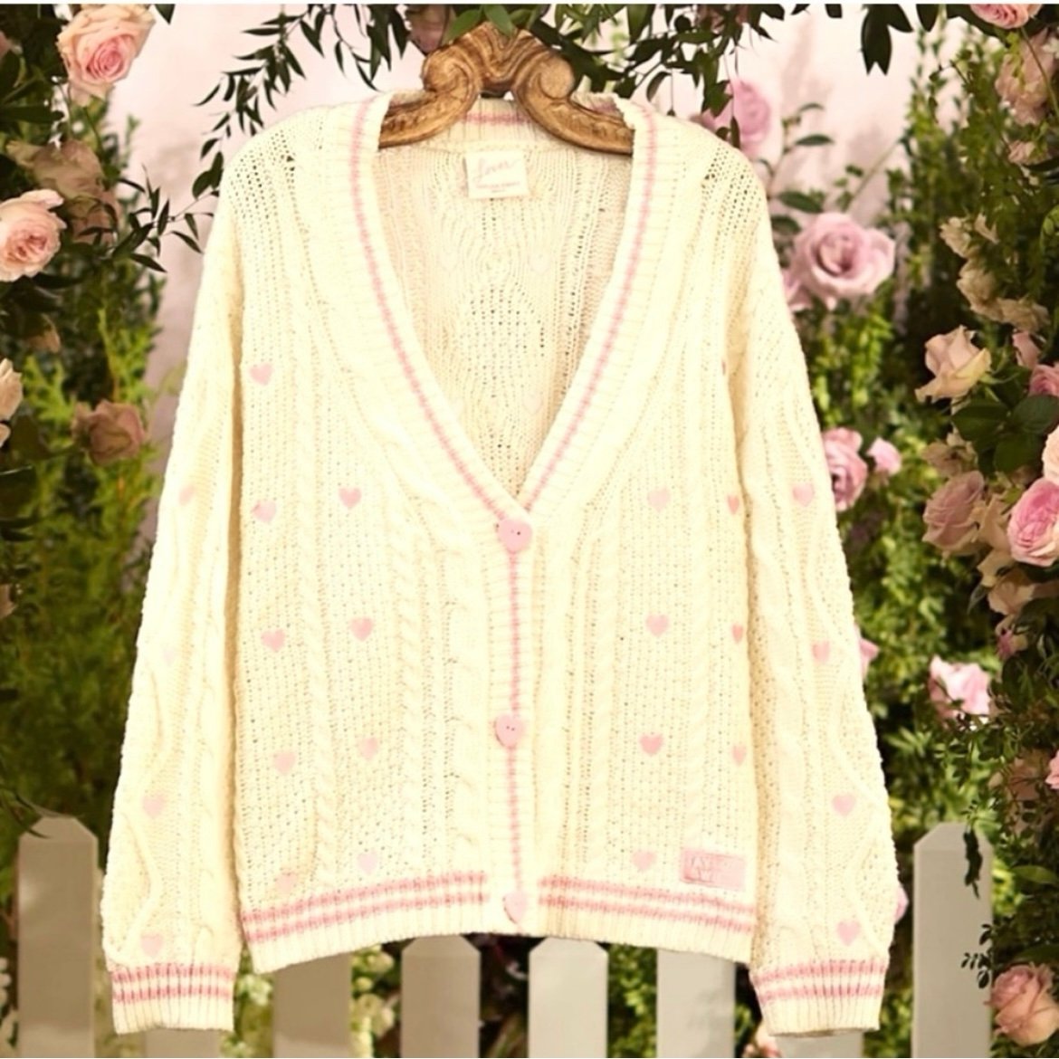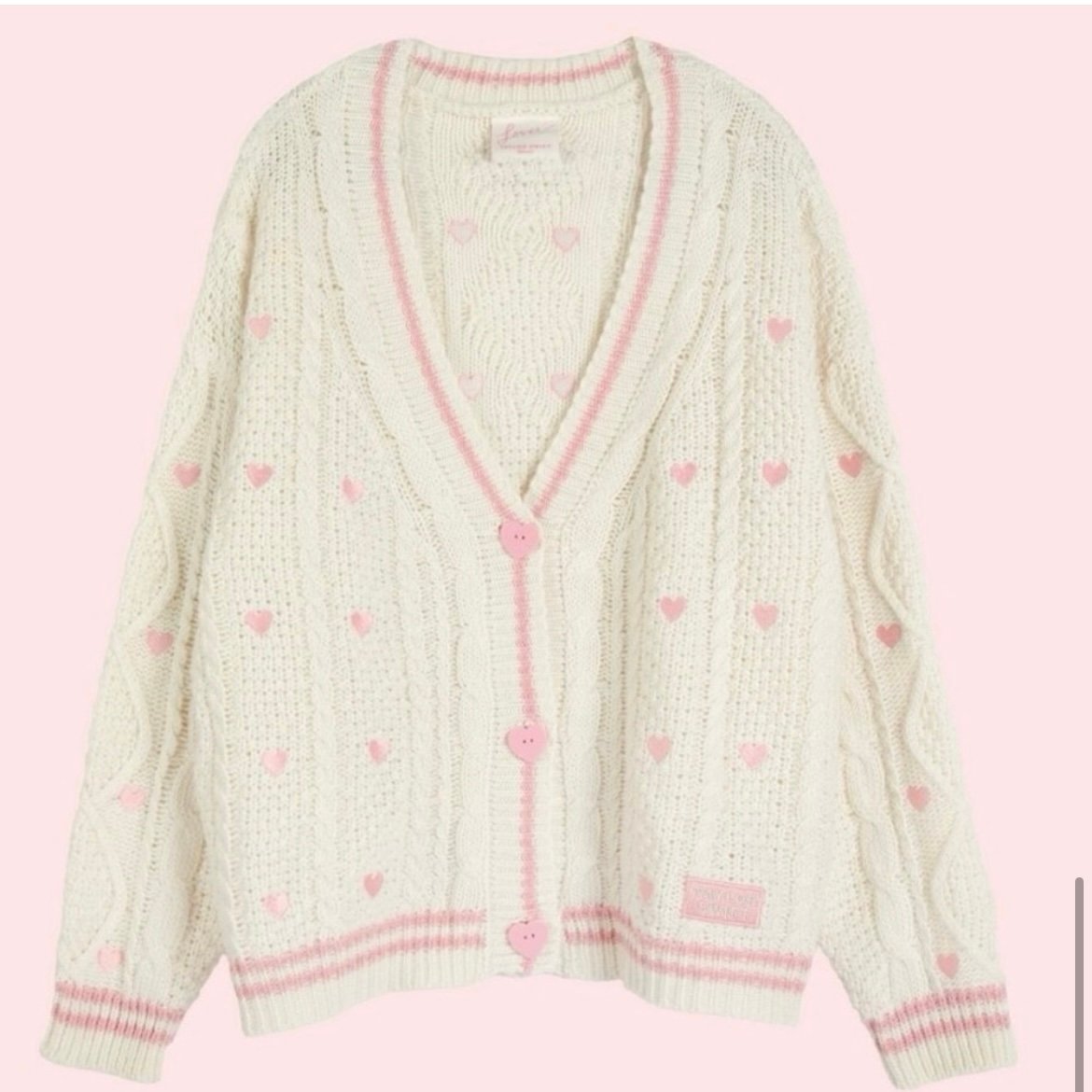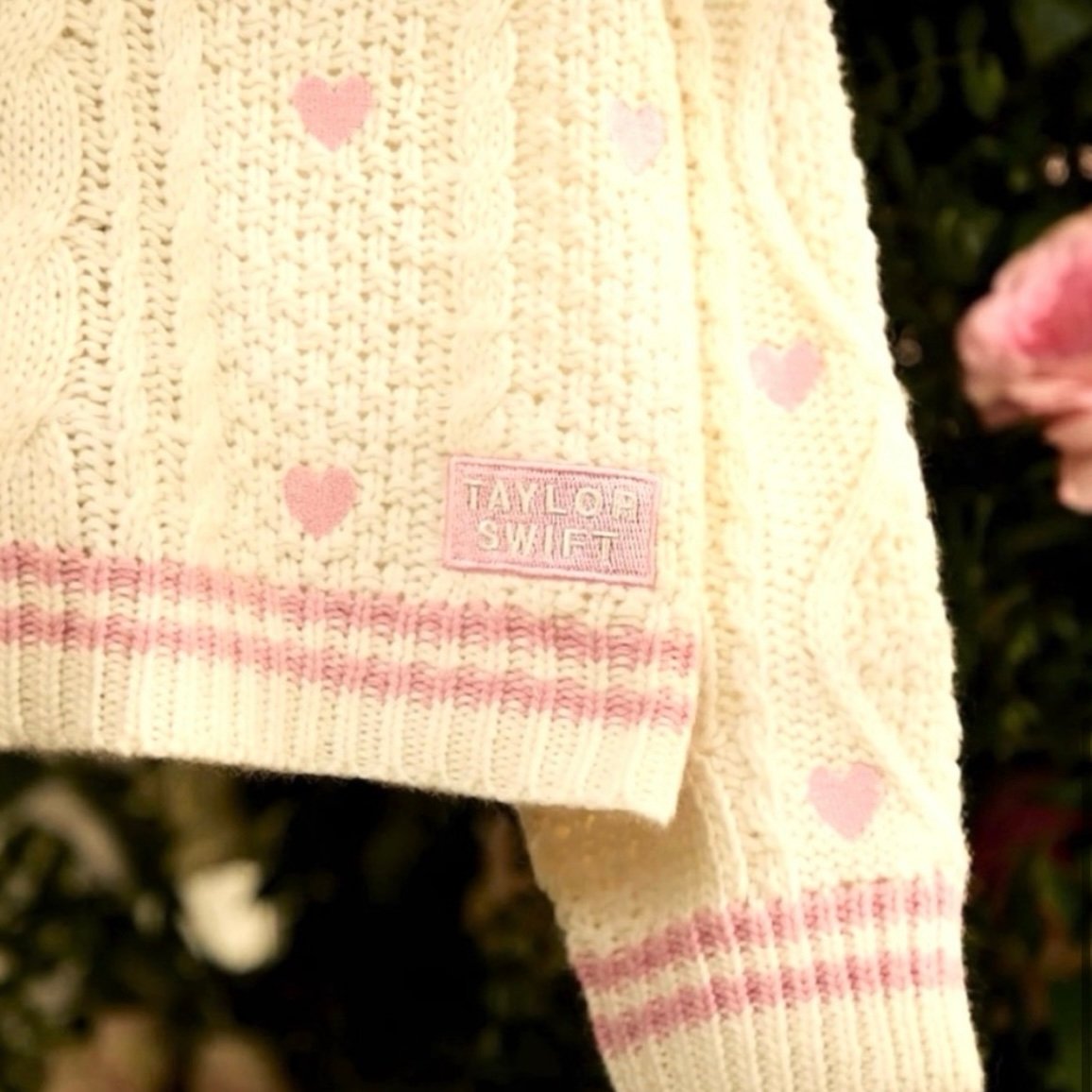 White/ cream chunky knit cardigan featuring pink embroidered hearts with stripe design on front and back. Knit design throughout. Heart-shaped buttons and official Taylor Swift patch at hip.