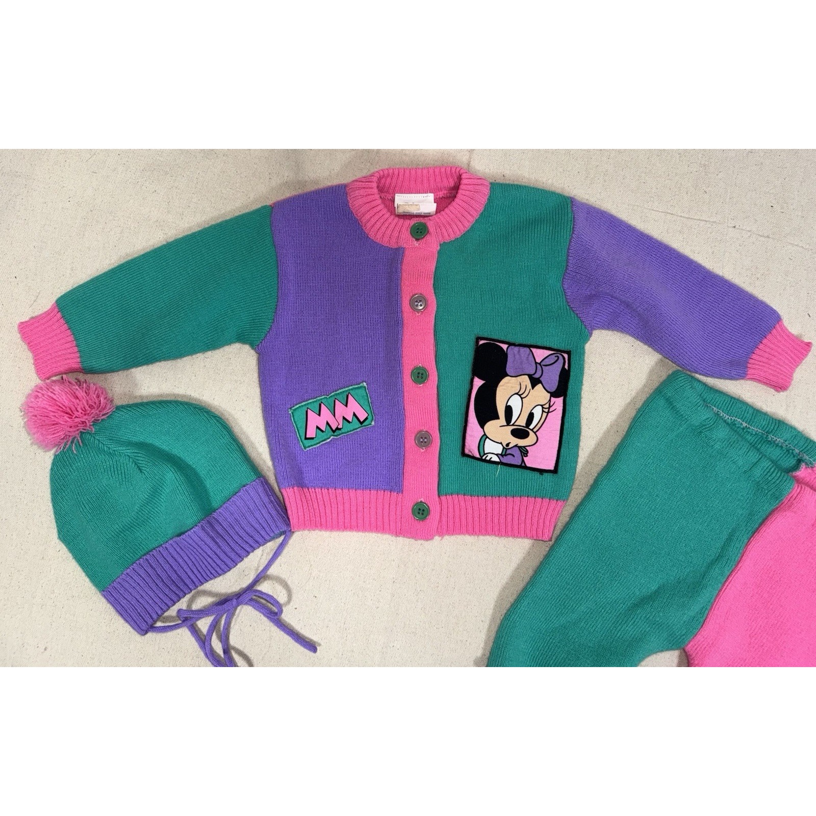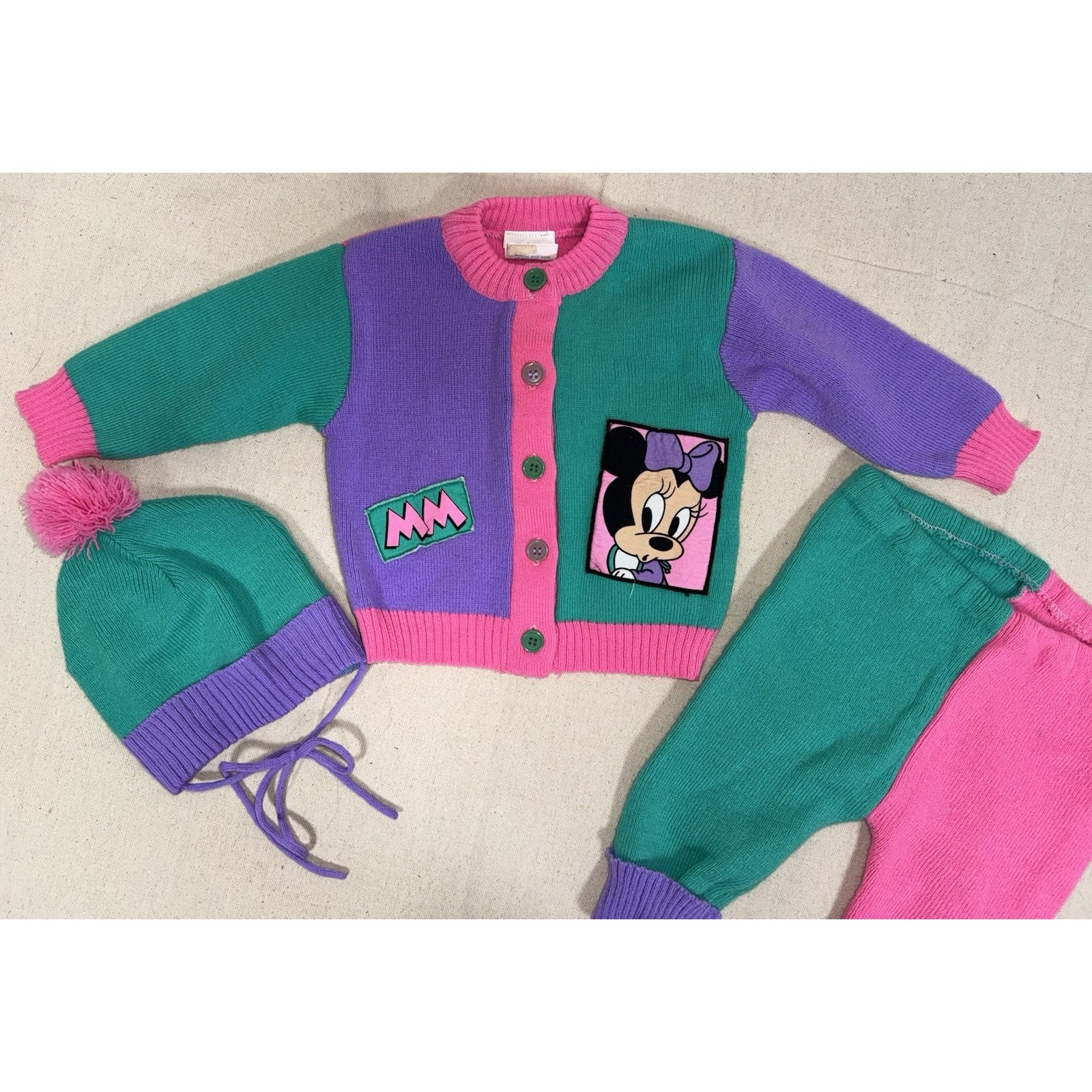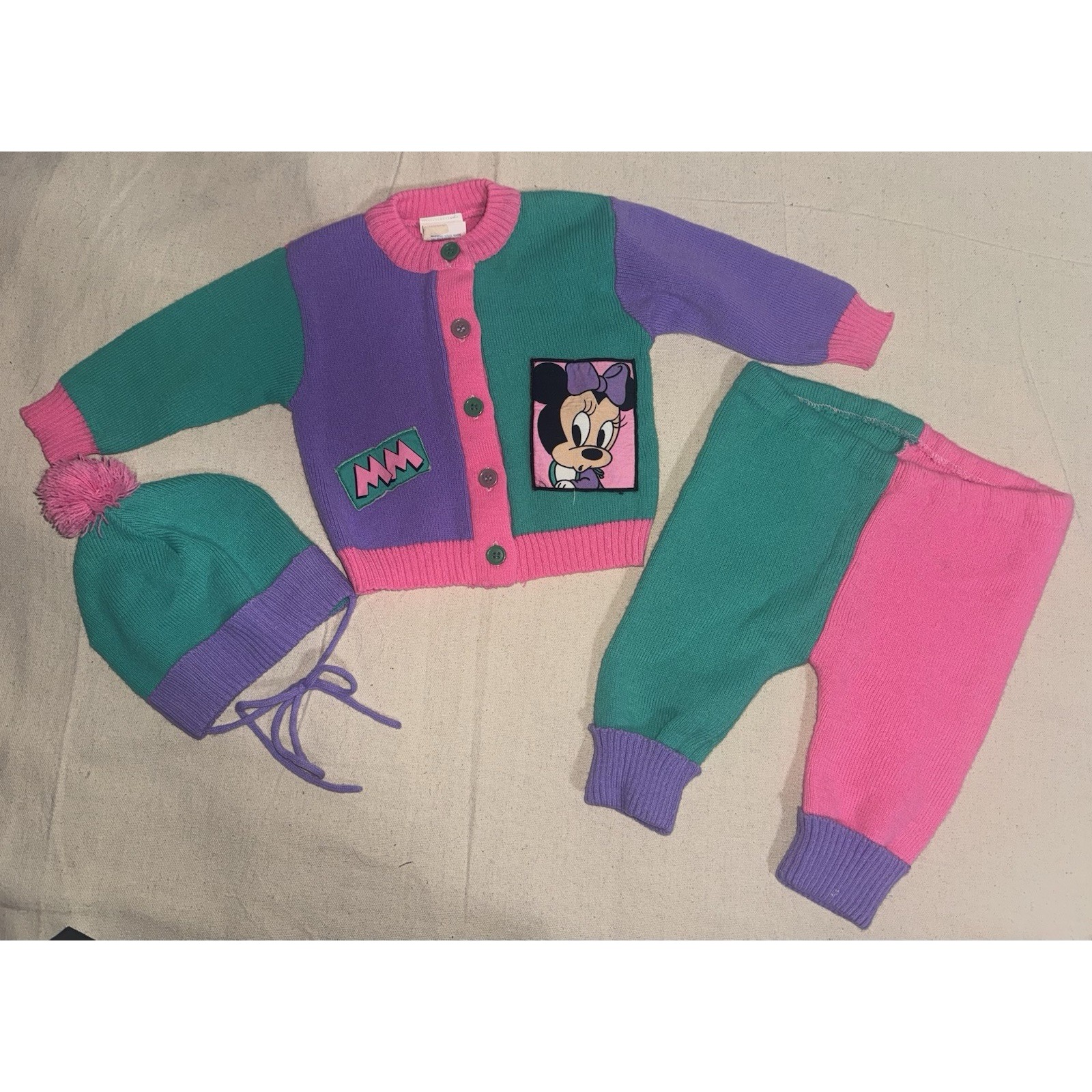 Vintage 1984 Disney Babies Minnie Mouse 3 piece sweater set. Retro color block pattern - sweater, pants and matching hat. Very good condition, one small spot on the cuff of the pants other than that I would say extremely good condition for its age.