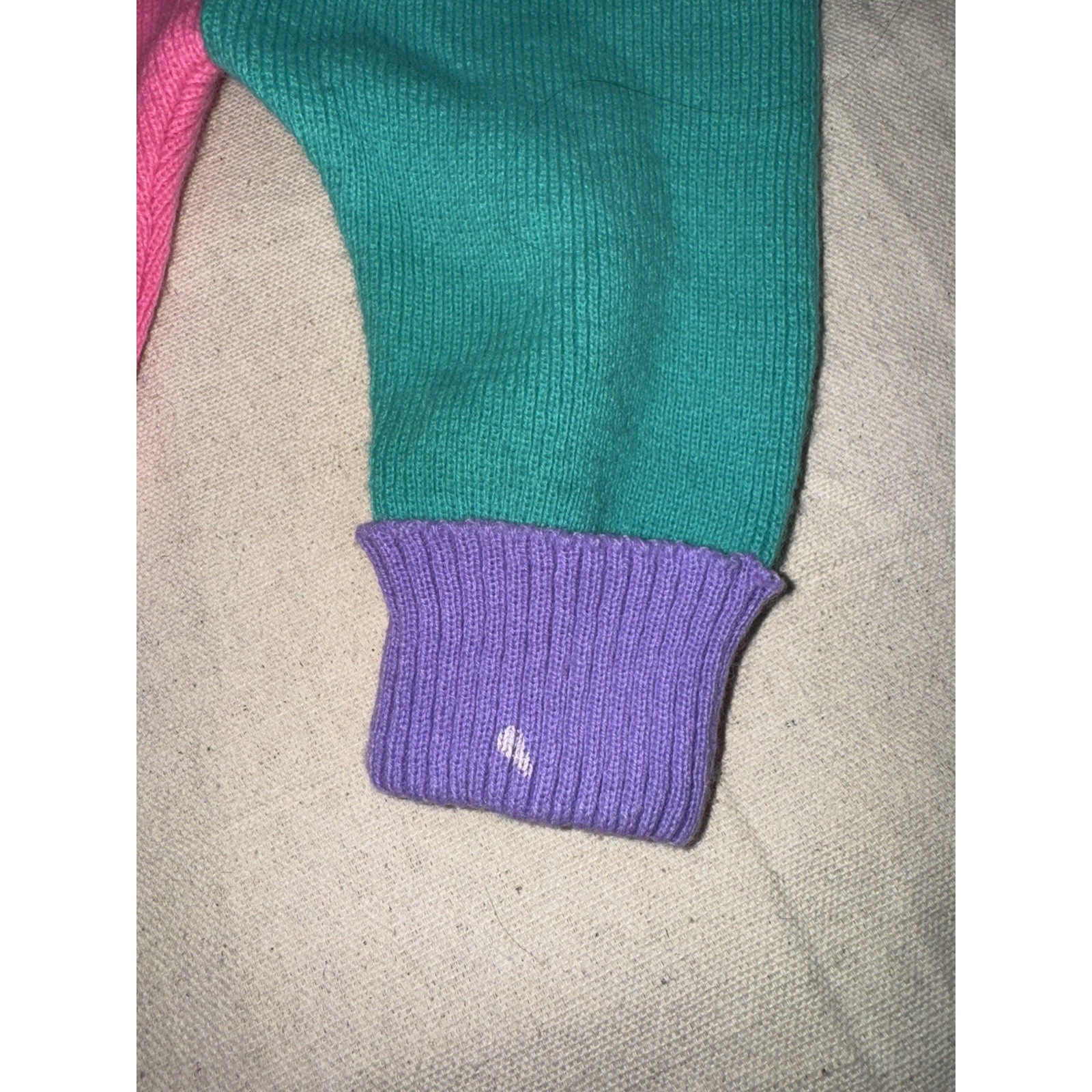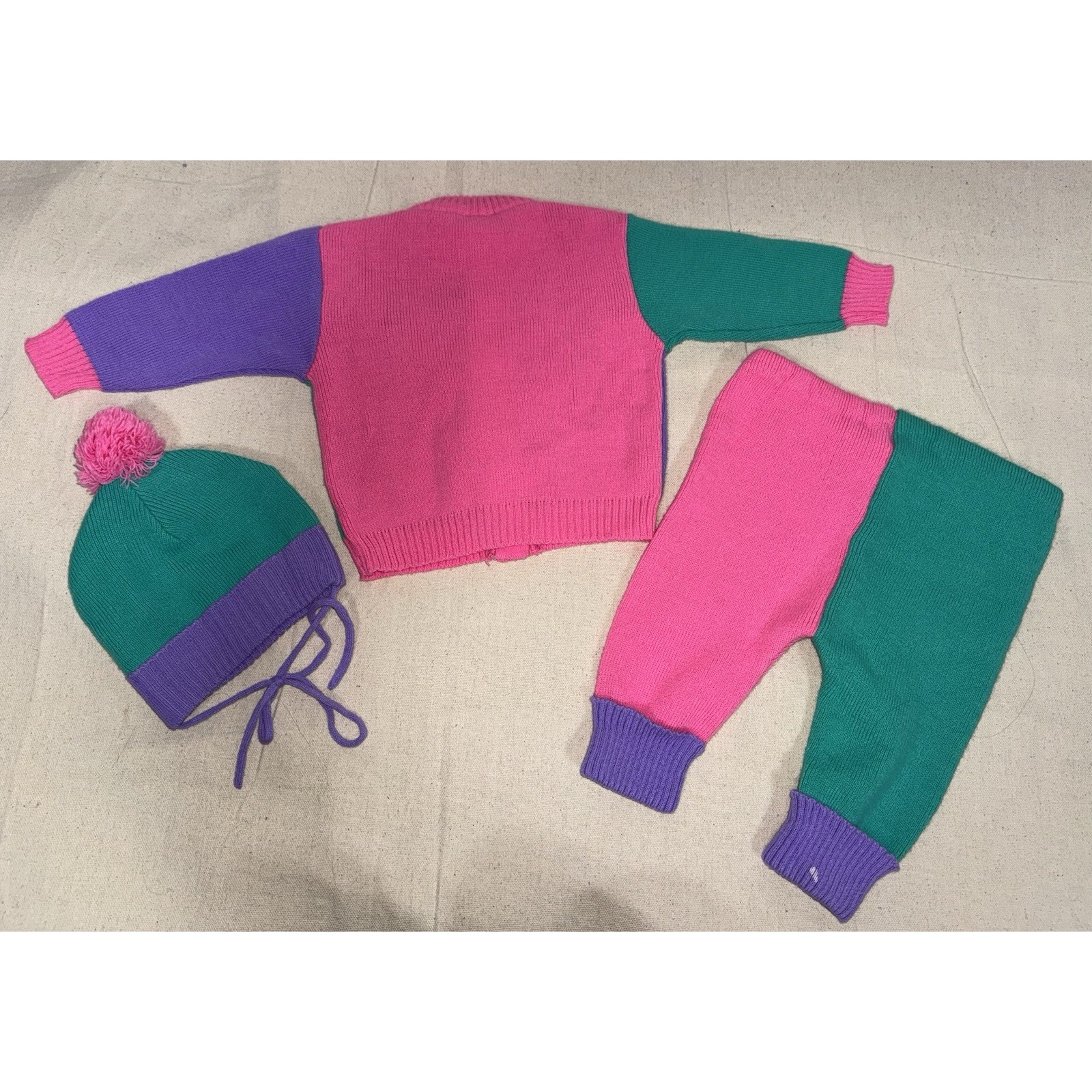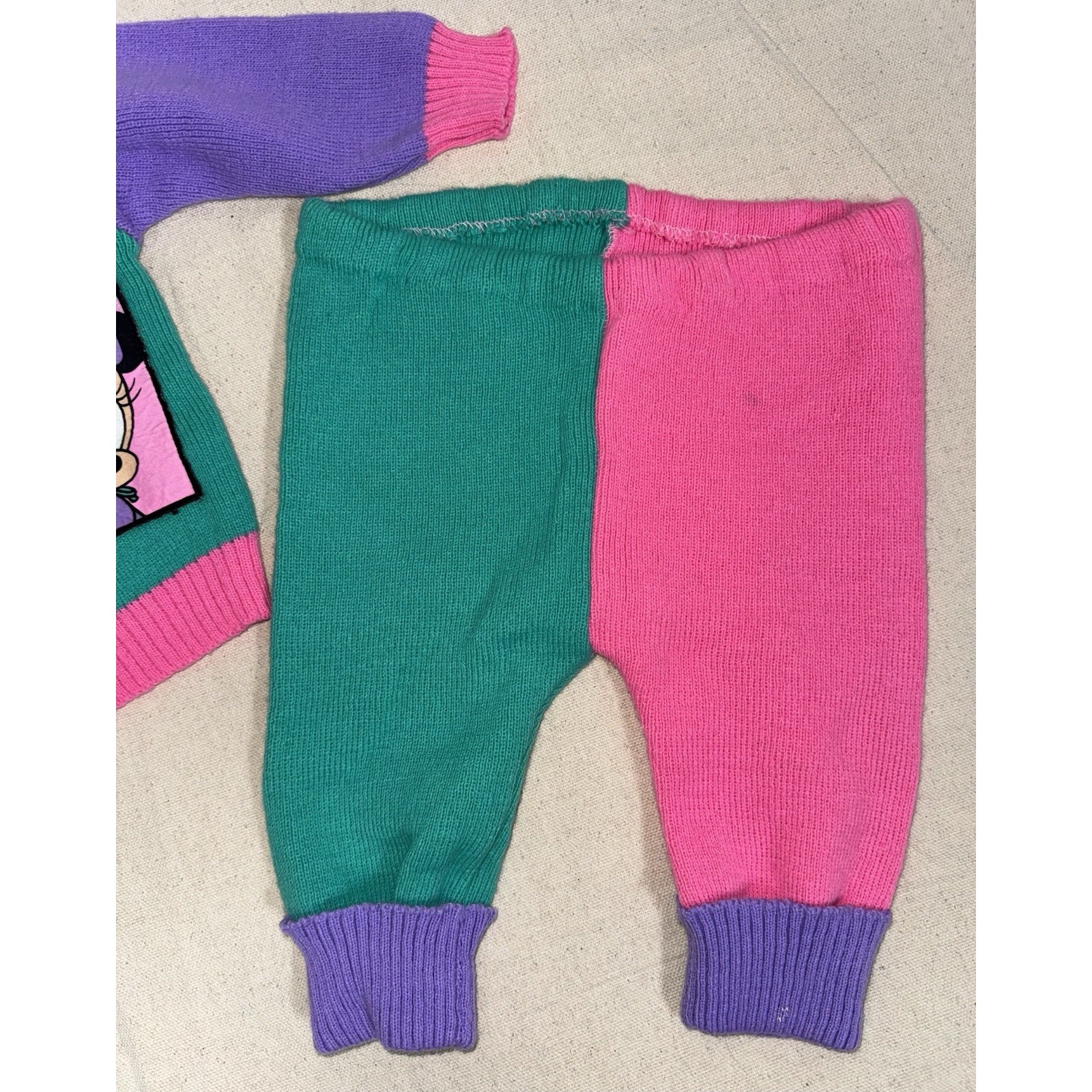 Vintage 1984 Disney Babies Minnie Mouse 3 piece sweater set. Retro color block pattern - sweater, pants and matching hat. Very good condition, one small spot on the cuff of the pants other than that I would say extremely good condition for its age.