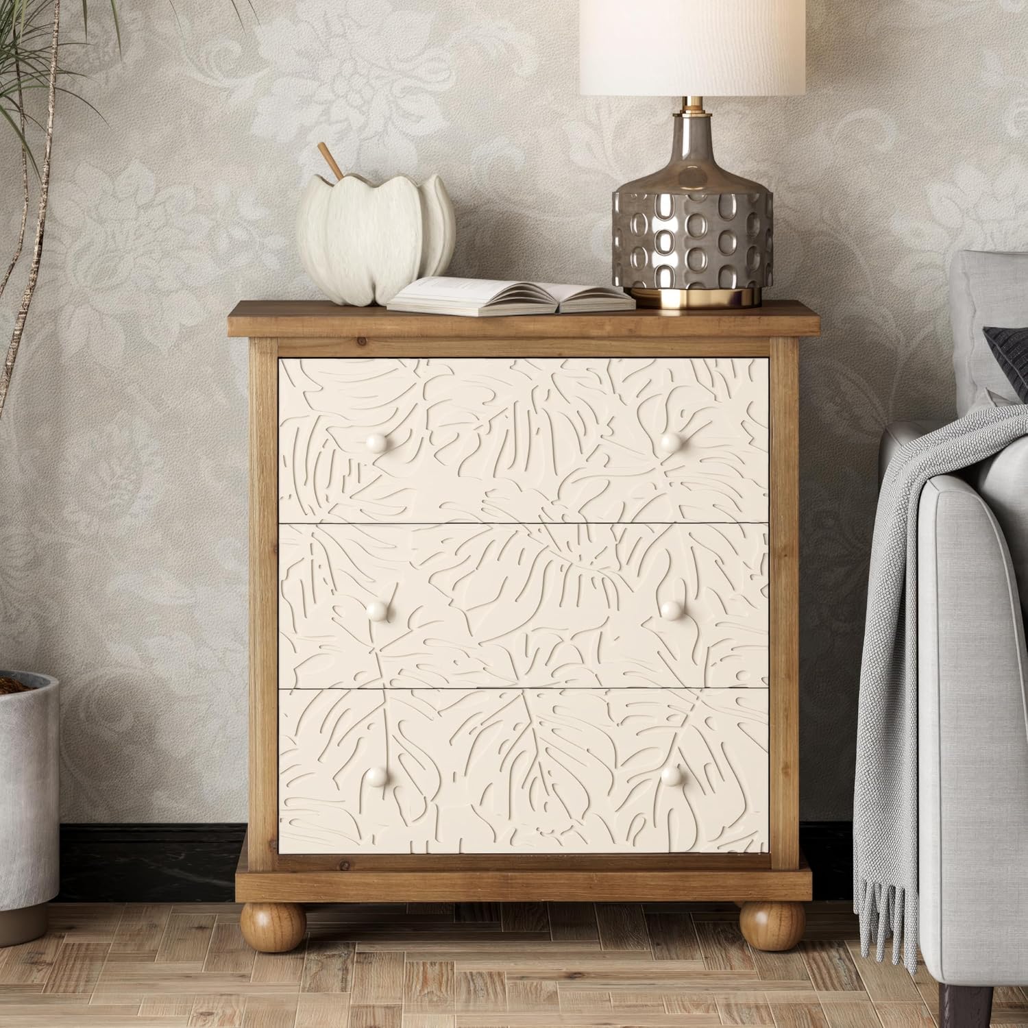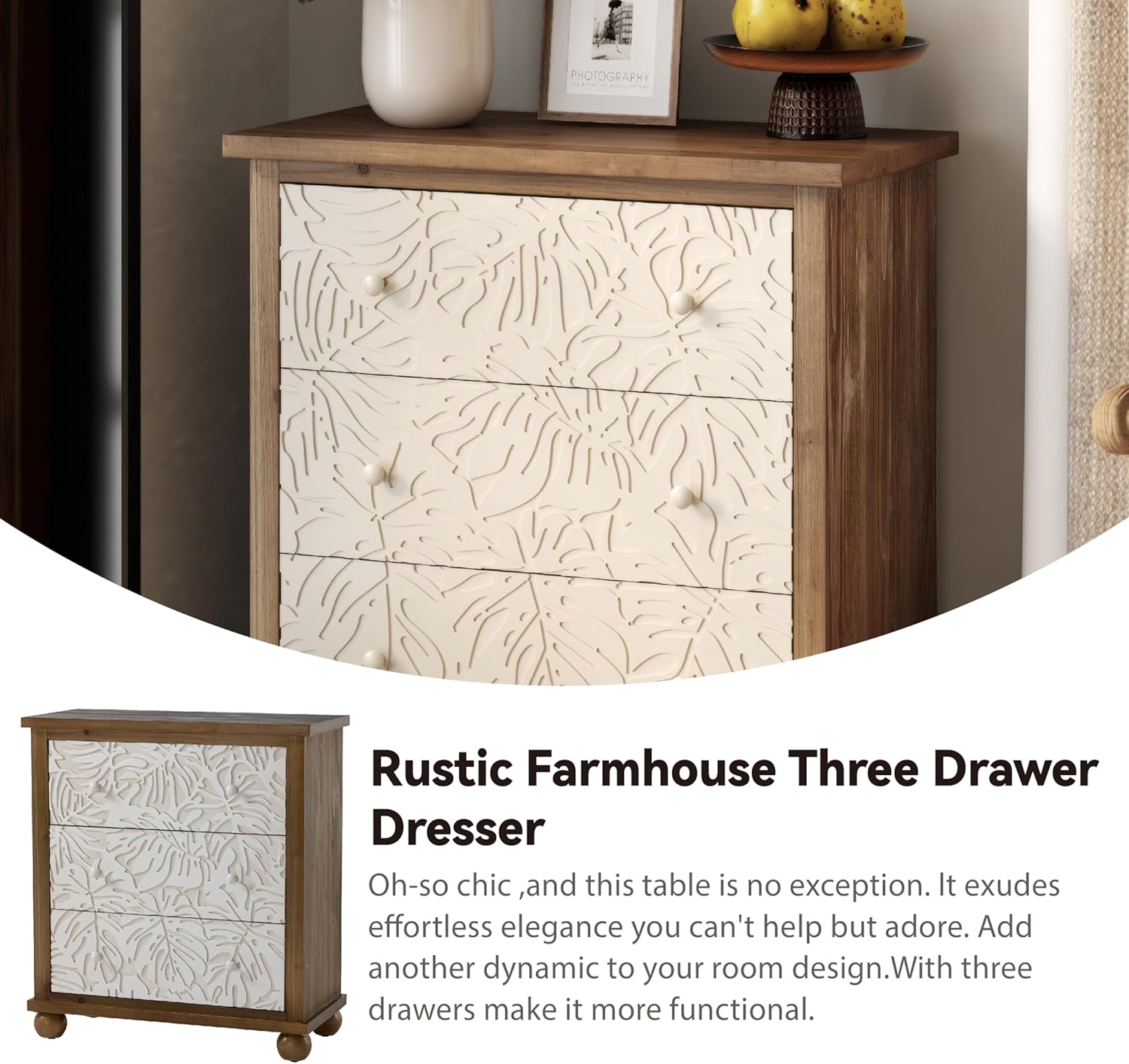 Farmhouse 3-Drawer Dresser With Leaves Pattern Carved, Vintage French Country Chest Accent Cabinet, Distressed Finish, White & Brown