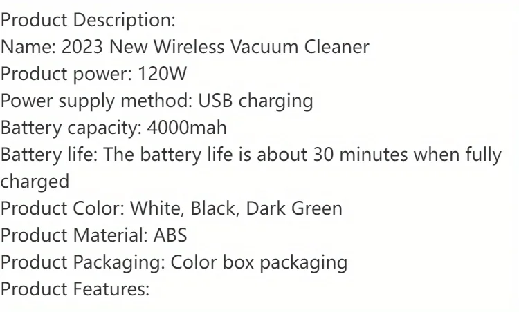 Name: 2023 New Wireless Vacuum Cleaner Product power: 120WPower