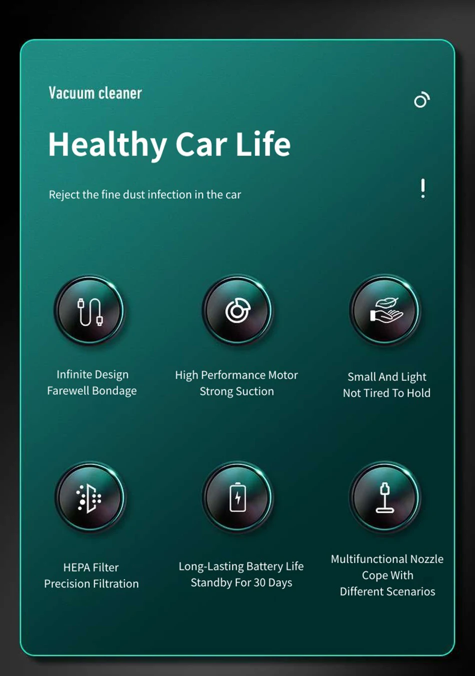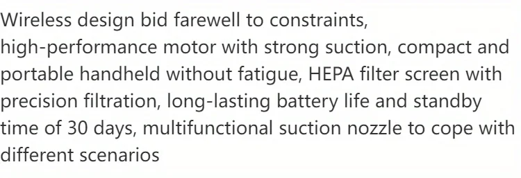 Wireless design bid farewell to constraints,high-performance motor with strong suction, compact and portable handheld without fatigue, HEPA filter screen with precision filtration, long-lasting battery life and standby time of 30 days, multifunctional suction nozzle to cope with different scenarios