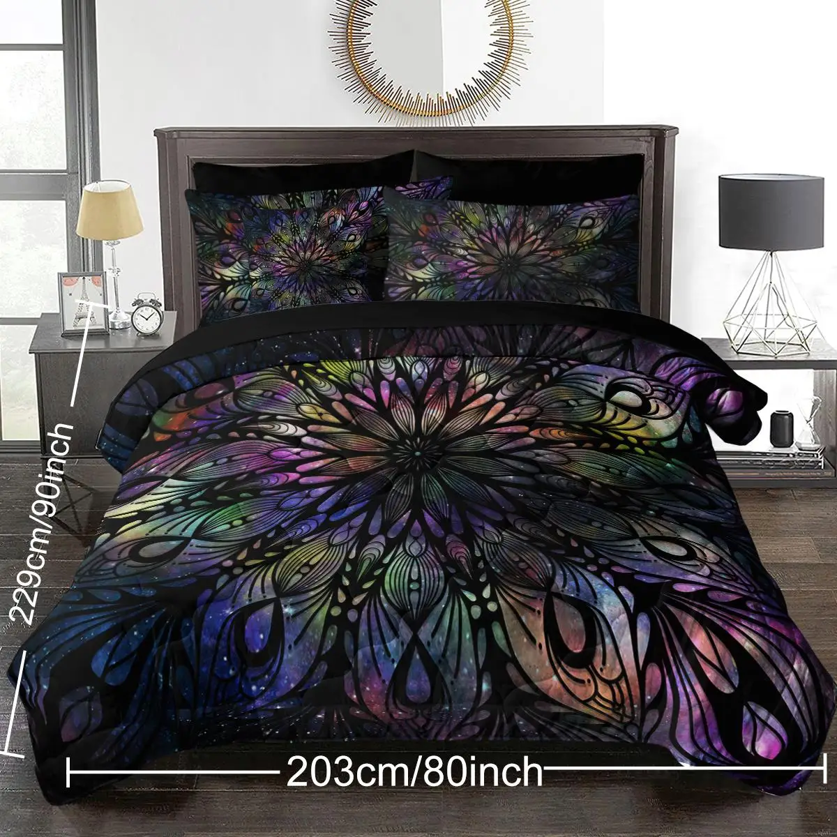 Queen Size: 1 Comforter: 90""x90""; 2 Pillow shams: 20""x36"