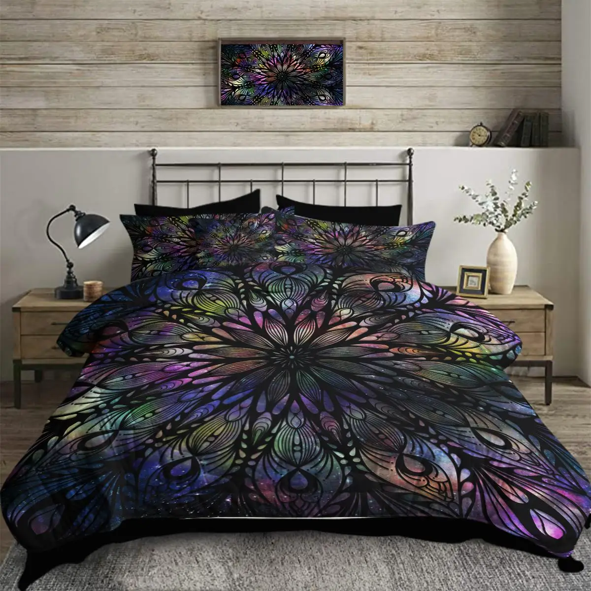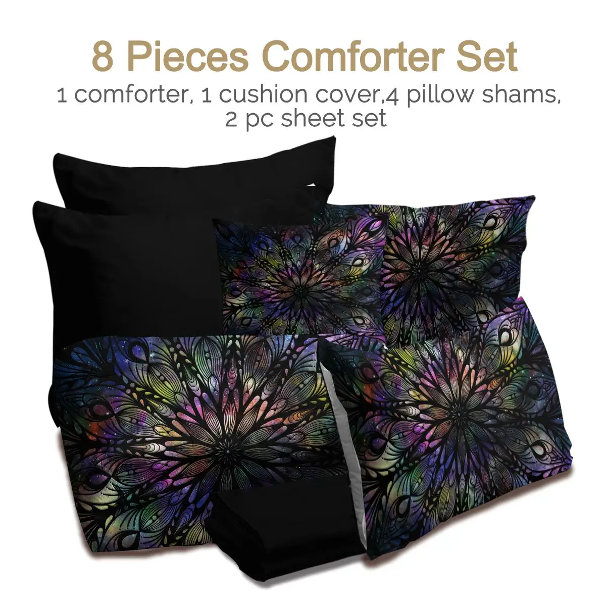 Package Includes: 1 Comforter +1 Pilow Cover+1 Flat Sheet+1 Fitted Sheet+4 Cushion Cover