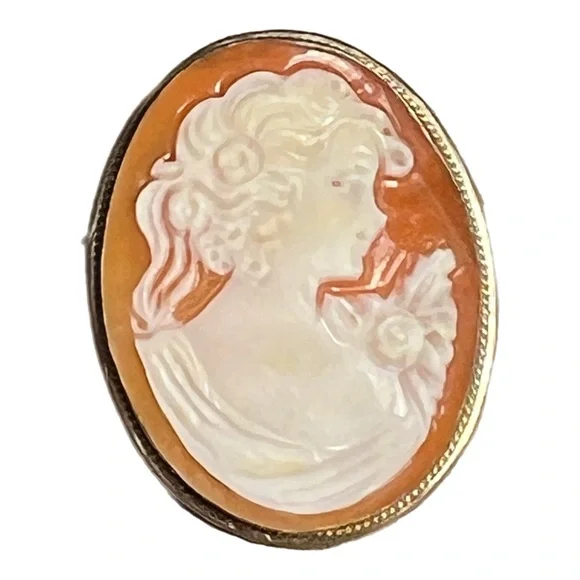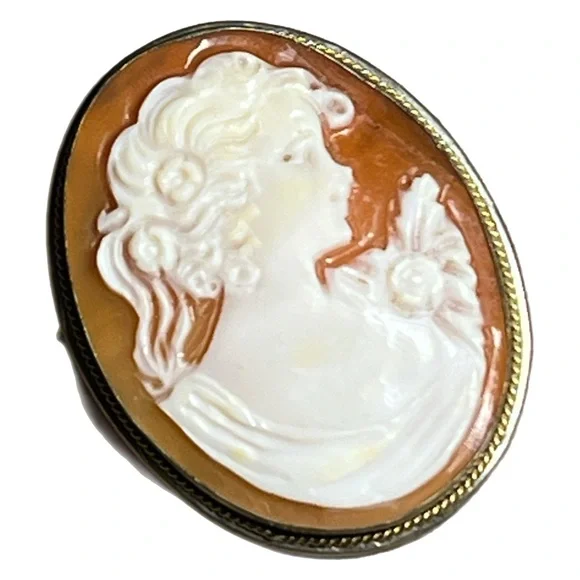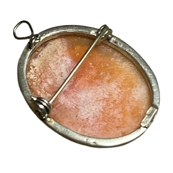 Vintage Cameo Brooch and PendantThis exquisite vintage cameo features a beautifully carved profile of a woman, set in a classic oval frame. The piece serves as both a brooch and a pendant, offering versatile wear. Its intricate detailing and timeless elegance make it a perfect addition to any jewelry collection. Made from sterling silver with a gold twisted accent. There is a makers mark but I cannot make it out. On back at bottom. Measurements are approximately:Length- 1 1/8”Width- 1”Depth- 1/4”As always, please buy responsibly. If you have any questions before purchase, please ask. I am always here for my customers.