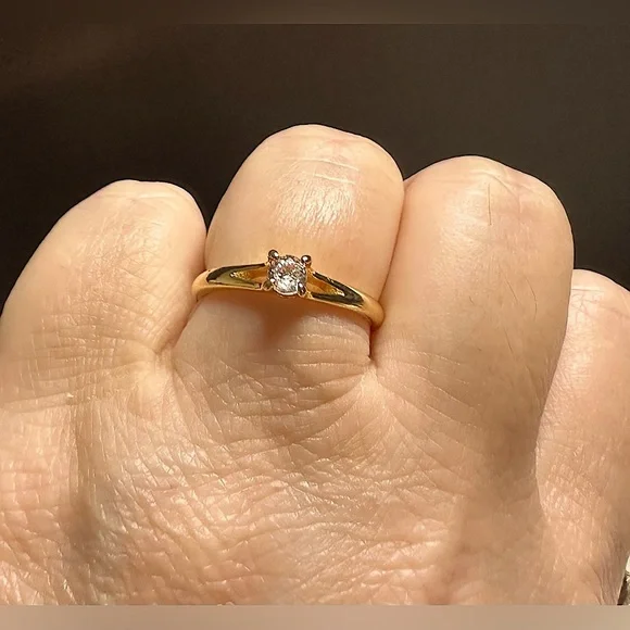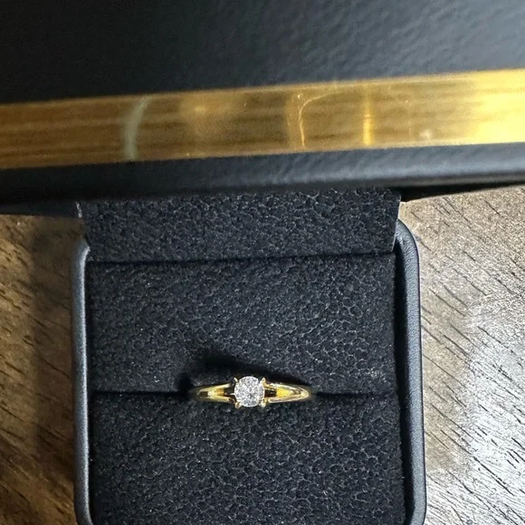 pretty engagement wedding ring 1/4 CT total synthetic diamondround cut centerpretty v like cut out , on each side of the diamond. 14k yellow gold over silver stamped arrives with ring box color : Dclarity : VVS1This ring does have factory tags attached. If you would like them removed,please let me know. creation : simulated diamondmain stone shape : roundStamped Authentic : yes finish : 14k yellowgold72-49
