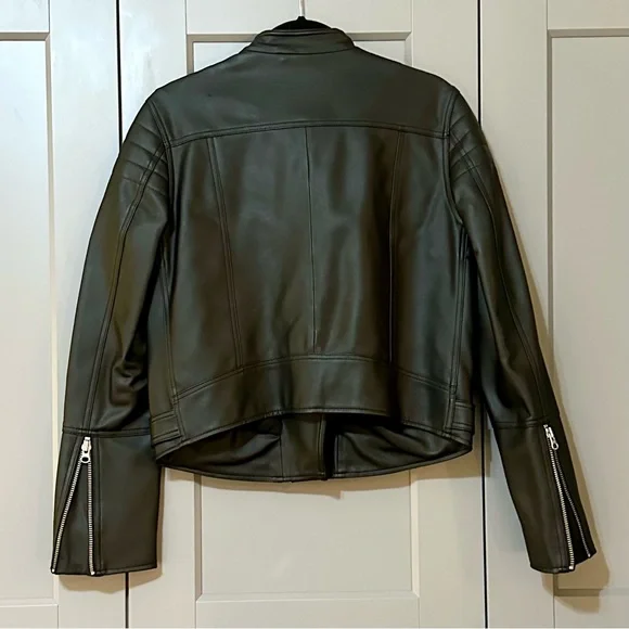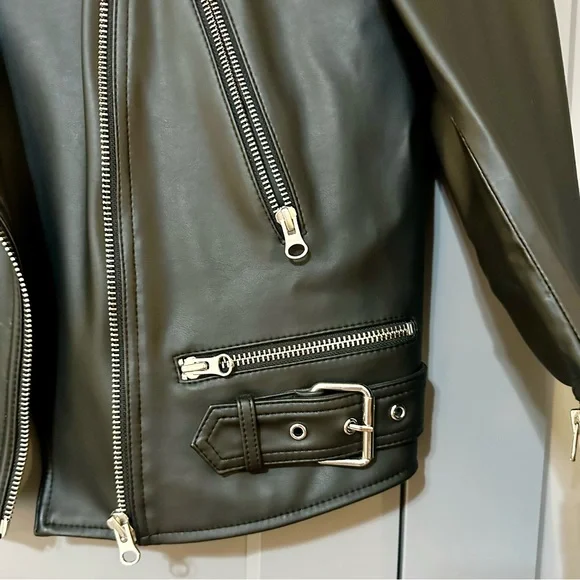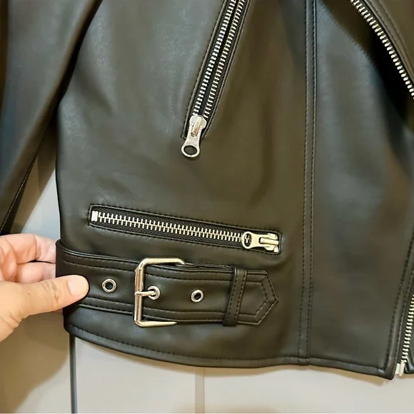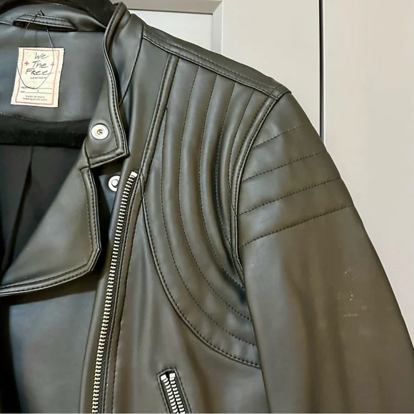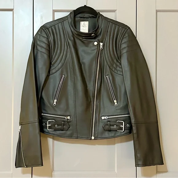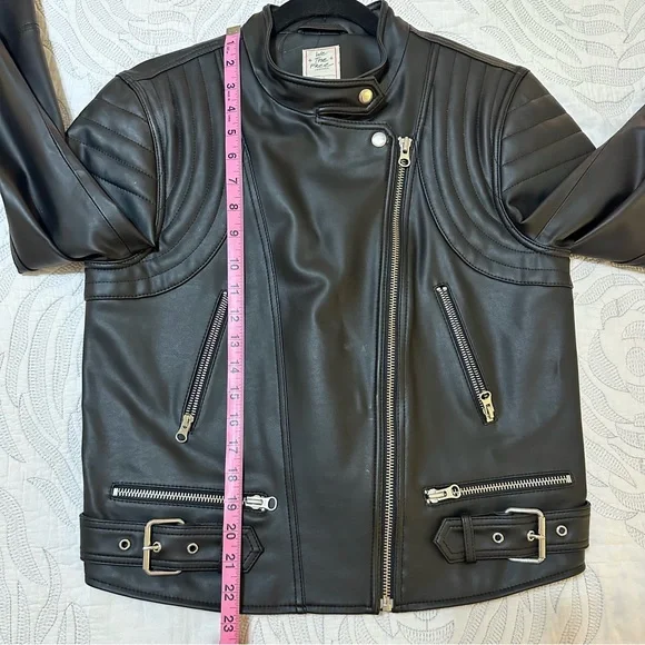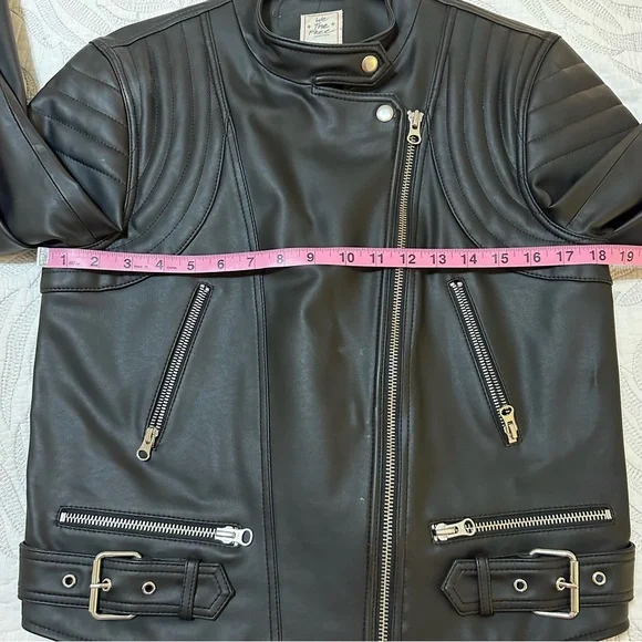Free People We The Free Fenix Leather Moto Jacket Classic Buckle Black Sz SmallNew without tagsSo luxe in a stunning leather fabrication, this timeless moto-style jacket is featured in a zip-front, boxy silhouette with staple seaming throughout for classic shape and dimension.Buckle detailing at bottomExaggerated zip featureBoxy silhouetteWe The FreeHeritage inspired and lived-in staples. We The Free is an in-house label.Care/ImportDry Clean OnlyImportApprox Measurements Sleeve Length: 25Bust: 37.5Length: 22Contents100% Leather