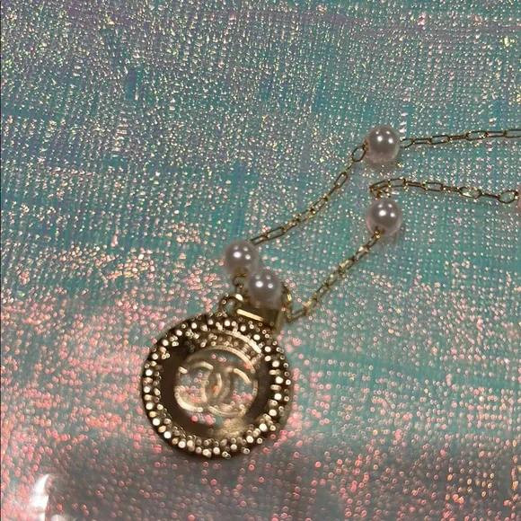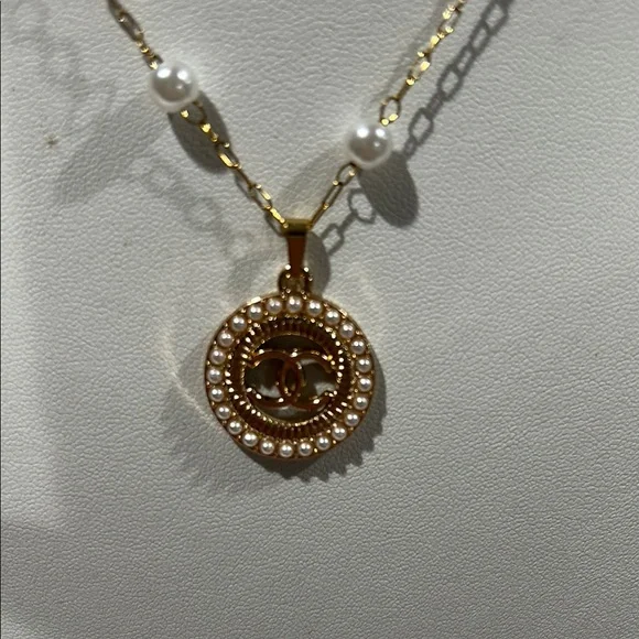 852. This exquisite authenticCHANEL up-cycled charm pendant necklace showcases on an 18k gold & pearl necklace ($98 Retail) , embodying a modern and versatile style. The piece features delicate chain links and intricate detailing, making it a standout accessory for any occasion. Its elegant design is perfect for adding a touch of luxury to your ensemble.