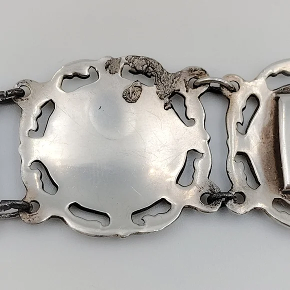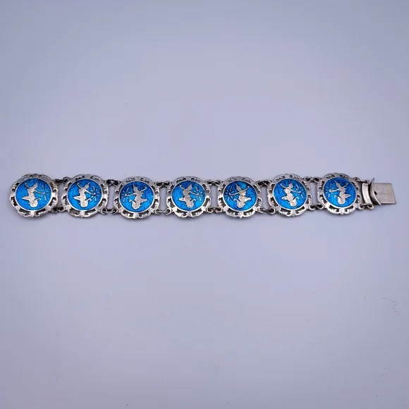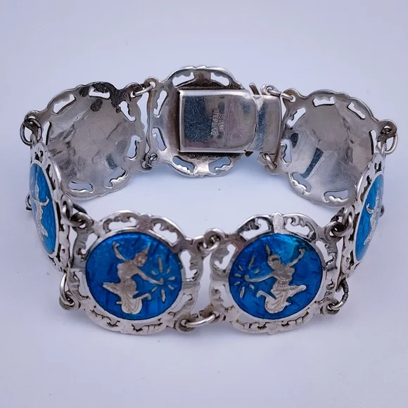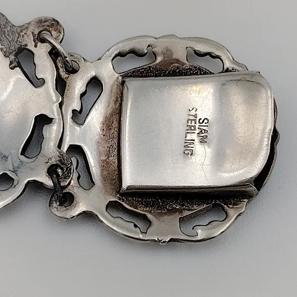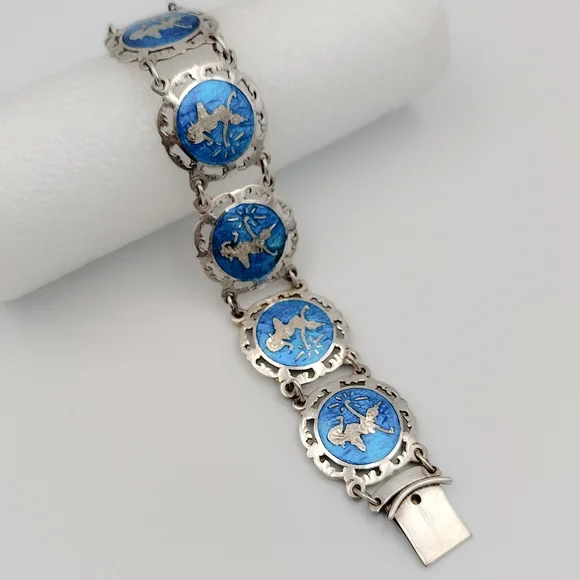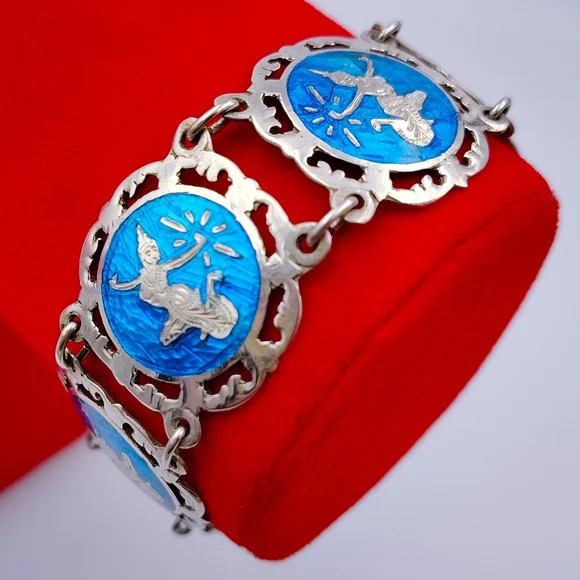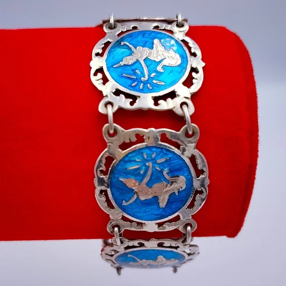 Vintage stamped SIAM STERLING sterling silver and blue enamel Siam panel link bracelet on the backside of one of the panels it looks like someone has put solder on it, but it doesn't affect the beauty to the front side. see photos Elegant women's bracelet featuring a stunning blue and silver design. Perfect for adding a touch of sophistication to any outfit.
