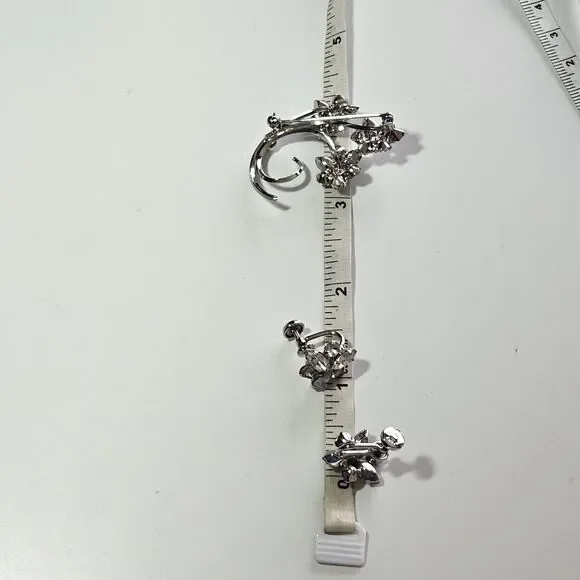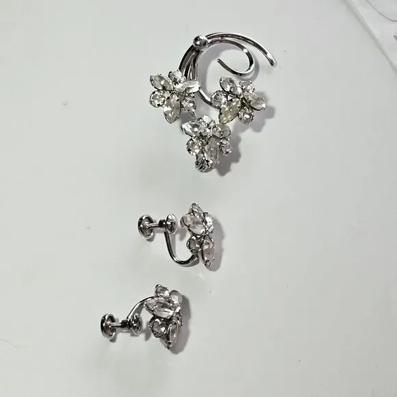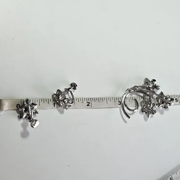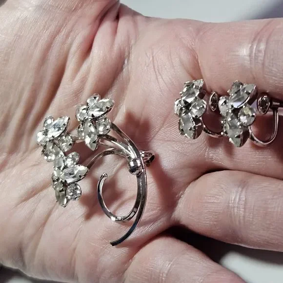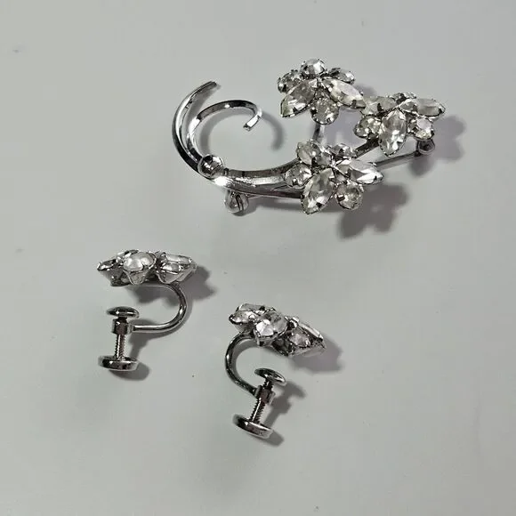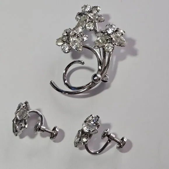 Add a touch of vintage and artistic elegance to your outfit with this stunning Star Art jewelry set. The set includes a rhodium-plated sterling brooch and screw back earrings, both adorned with sparkling rhinestones that will catch the light beautifully. The brooch features a beautiful flower and plant design, perfect for those who love beauty and art.This jewelry set is signed by Star Art, a brand known for their high-quality and unique pieces. It is perfect for those who appreciate vintage and antique jewelry, and would make a great addition to any collection. Whether you're dressing up for a special occasion or adding a touch of glamour to your everyday look, this set is sure to impress.