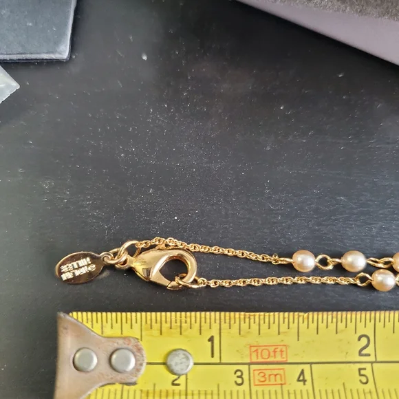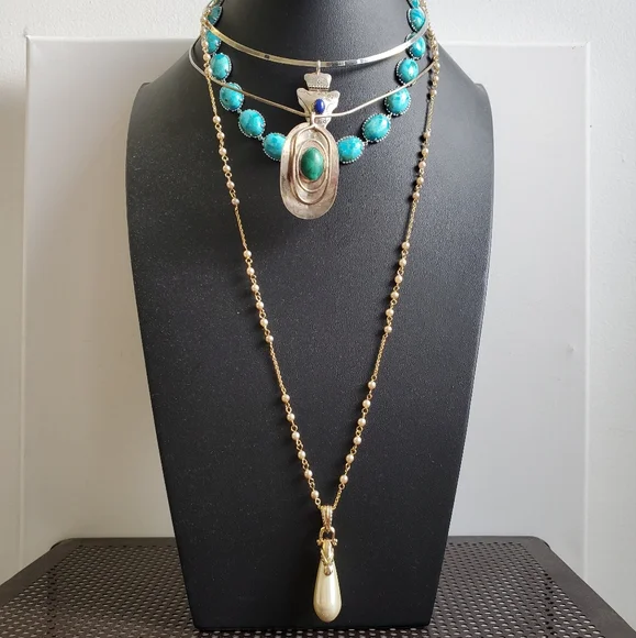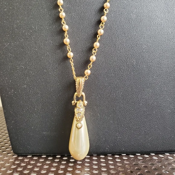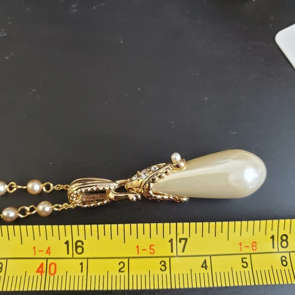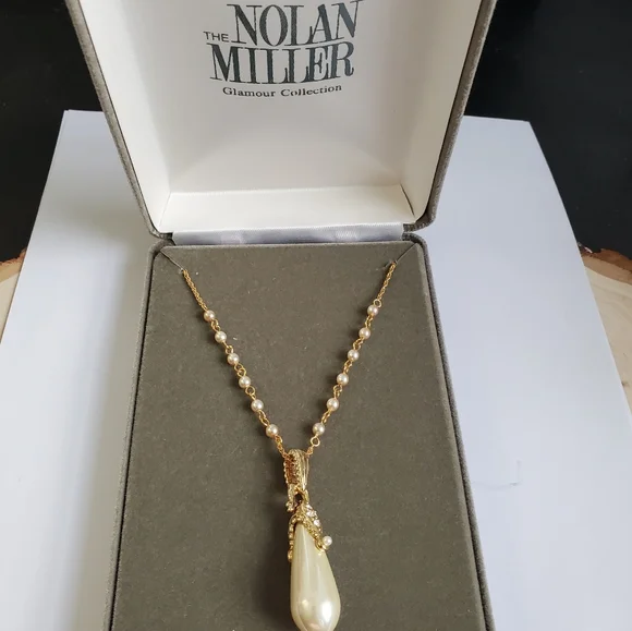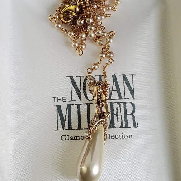 This stunning gold necklace from the Nolan Miller collection exudes vintage glamour and sophistication. It features a delicate chain adorned with small, evenly spaced faux pearls, which add an elegant texture to the overall design. The centerpiece is a dramatic teardrop pendant, a lustrous pearl-like drop that gracefully hangs from a detailed gold cap embellished with sparkling crystals. These accents give the piece a refined sparkle, enhancing its luxurious appeal.The gold chain and pearl design extend down the necklace in a balanced and seamless flow, leading to the pendant that serves as the focal point. When worn, this necklace has a length that makes it perfect for layering or as a standalone statement piece, adding an opulent touch to any outfit.Ideal for formal events or adding a classic charm to any ensemble, this Nolan Miller necklace captures the timeless beauty of fine jewelry, making it a treasured addition to any collection. Its combination of faux pearls, gold tones, and intricate craftsmanship embodies the legacy of Nolan Miller’s celebrated designs in Hollywood elegance.