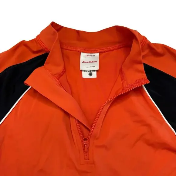 HANNA ANDERSSON Rash Guard Top in Orange & Black with 1/4 Zip. Size 8 / 130 Unisex Kids. Long Sleeve. Great sun protection for pool or beach. Easy on-off with the zippered neckline. Excellent condition with only minor signs of normal wash/wear (minor wear at hem threads) — no rips, stains, or holes. Retail: $46I strive to completely and accurately describe all items. All photos are of the actual item unless otherwise specified. Please ask any questions you have before offering or buying. I always try to get back your messages within 24 hours.Thank you so much for looking!—GrenouilleDanielle
