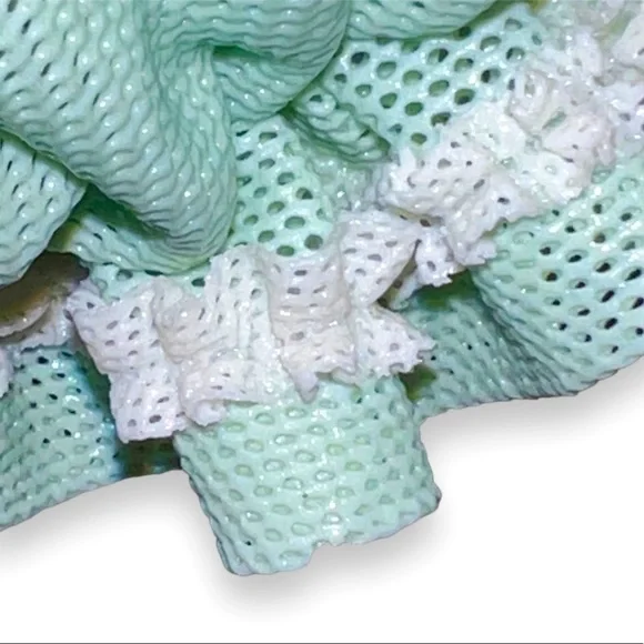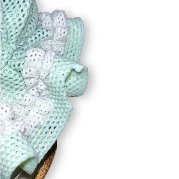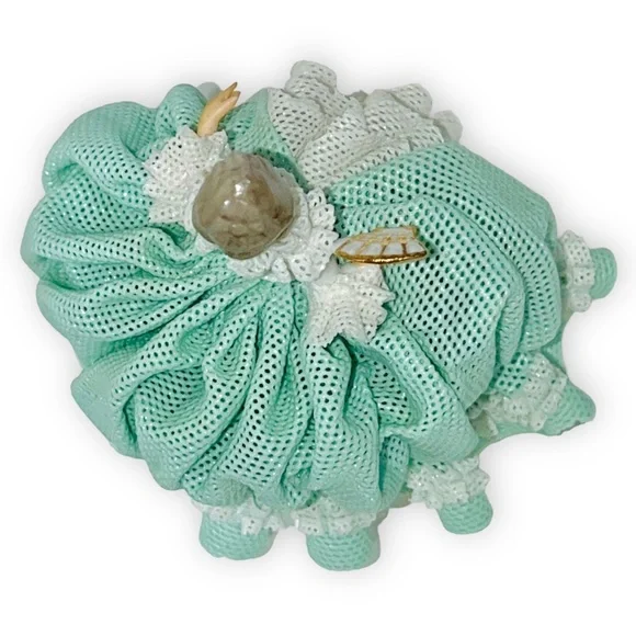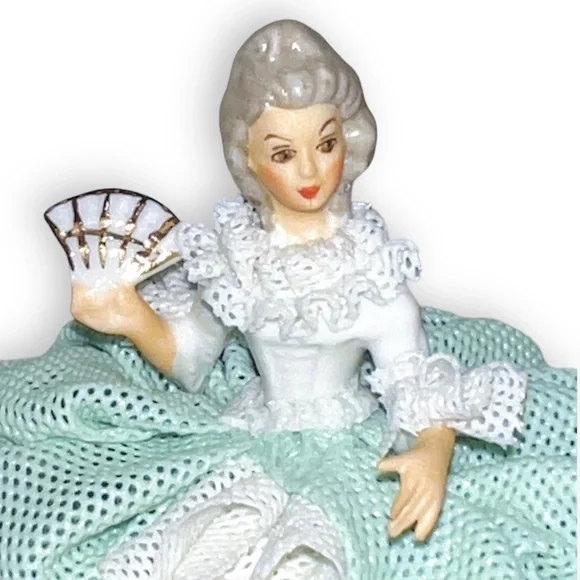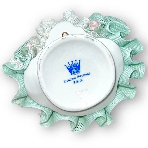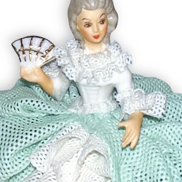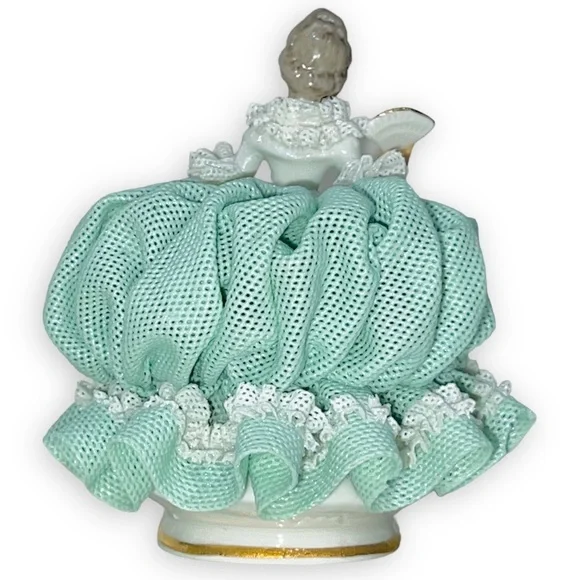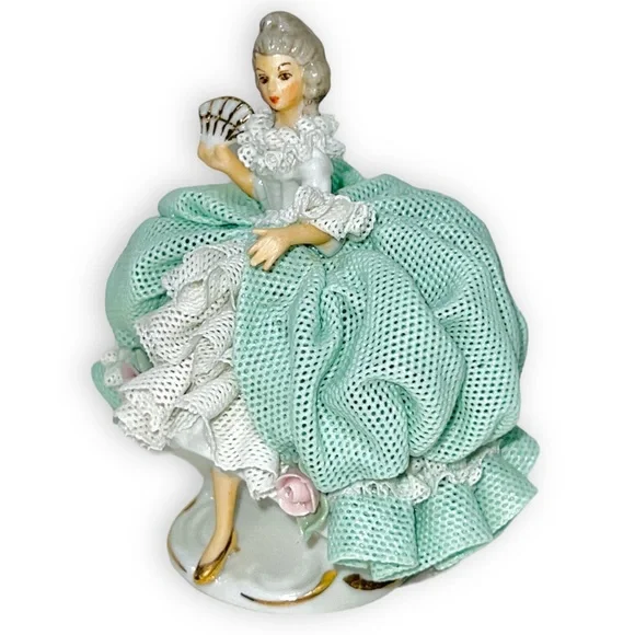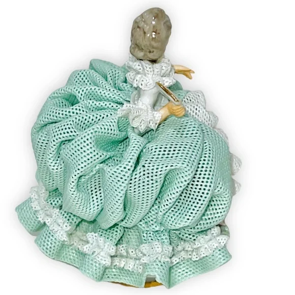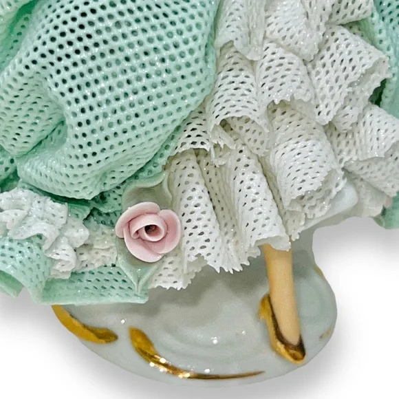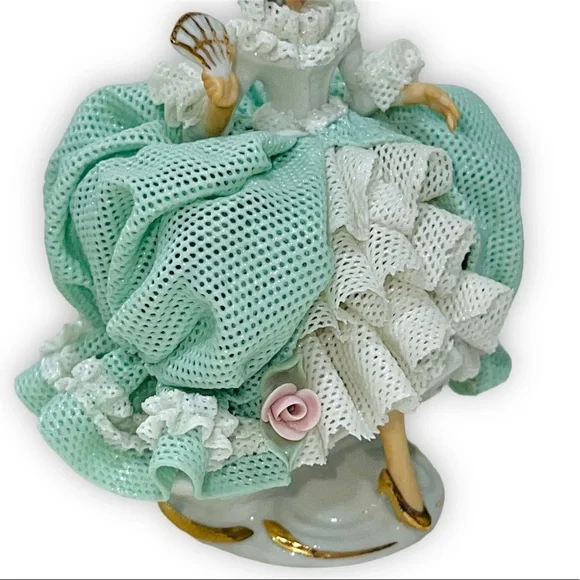 Beautiful Tiny Porcelain lace lady figurine approx 4” pink & mint green and white ruffled ball gown dress with pink roses holding fan and showing one golden high heel shoe, clearly marked on the bottom Germany Dresden and numbered, she’s in great/excellent vintage condition as shown minor wear to the lace as shown in photos
