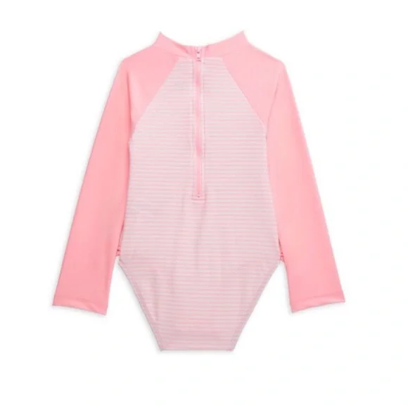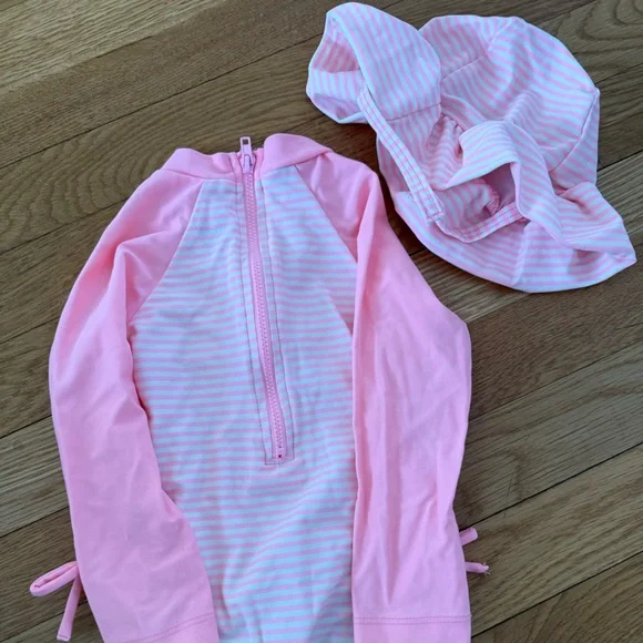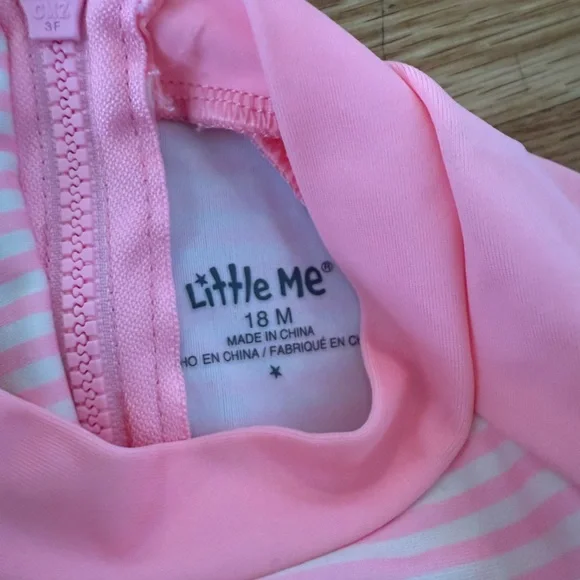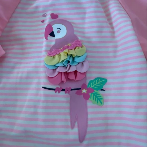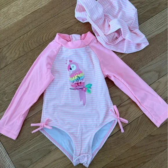 LIKE NEW Little Me one piece swimsuit, 18 Mo. and matching hat. Adorable pink swimsuit with a colorful parrot design. Features long sleeves and side ties.- Mock neckline- Long sleeves, raglan- Back zipper- Side bow details- Lining: 100% Polyester- 82% Nylon & 18% spandex- Machine wash- ImportedStyle Number: 0400020639013