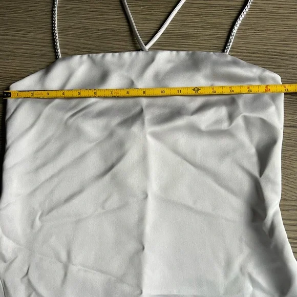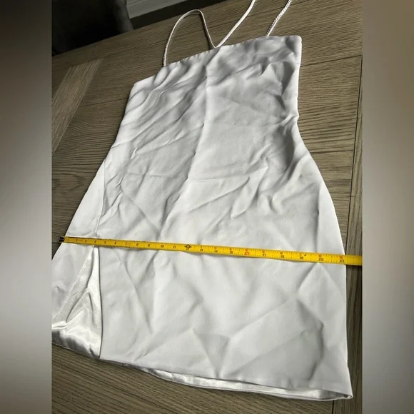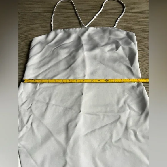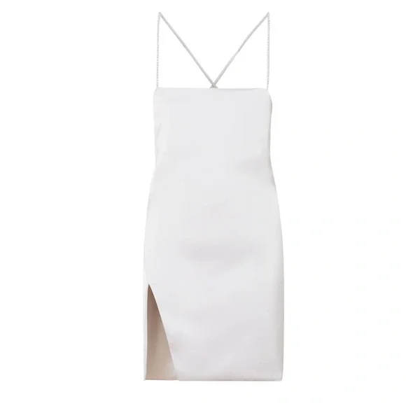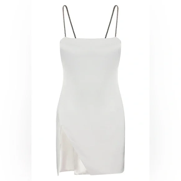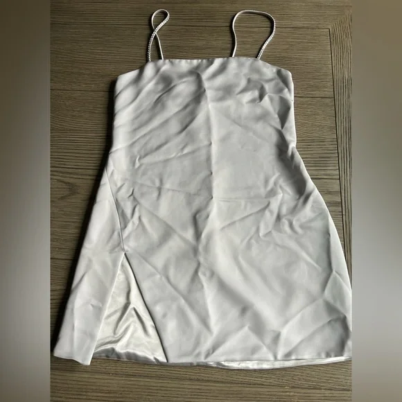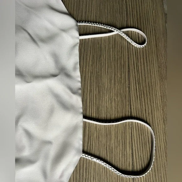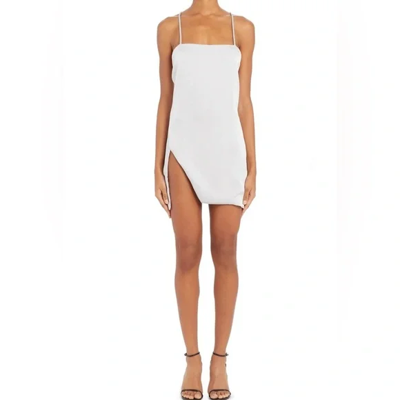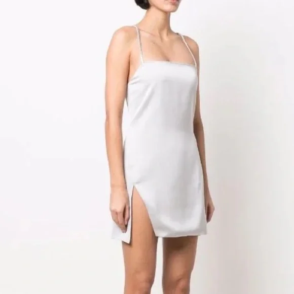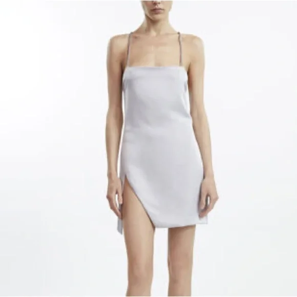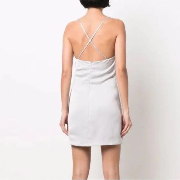 Light grey Fujiko crystal-strap mini dress from The Attico featuring crystal embellishment, thin shoulder straps, rear criss-cross straps, square neck, shift style, rear zip fastening and side slit. Dainty crystal studs illuminate the slim straps of a slinky minidress sewn from icy double-face satin with a slit that stops short of the hip.26" center front length (size 46)Hidden back-zip closureSquare neckSleevelessSide slitStretch lining100% polyesterDry cleanMade in ItalyWomen's Designer ClothingNew with tags ( no original tags) Buy more save more !!! Please check out my closet and follow me:-)