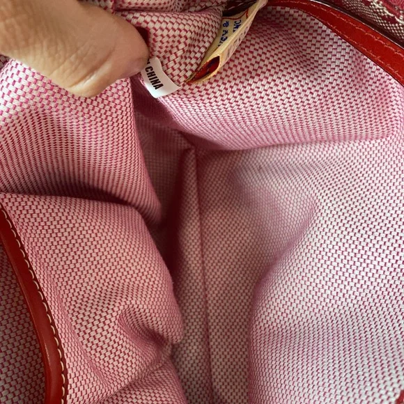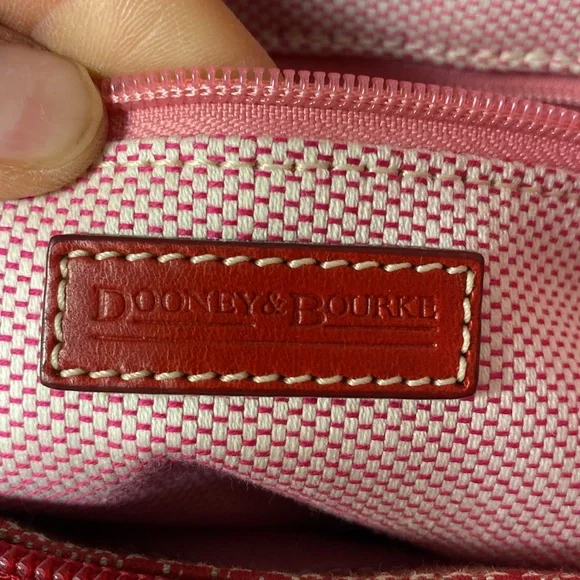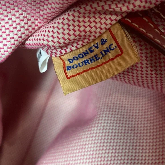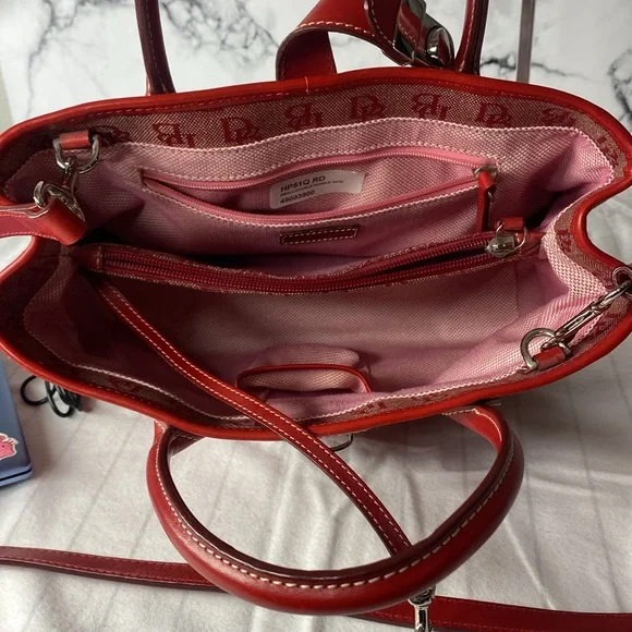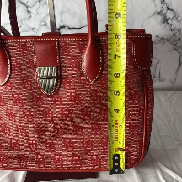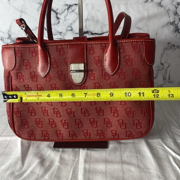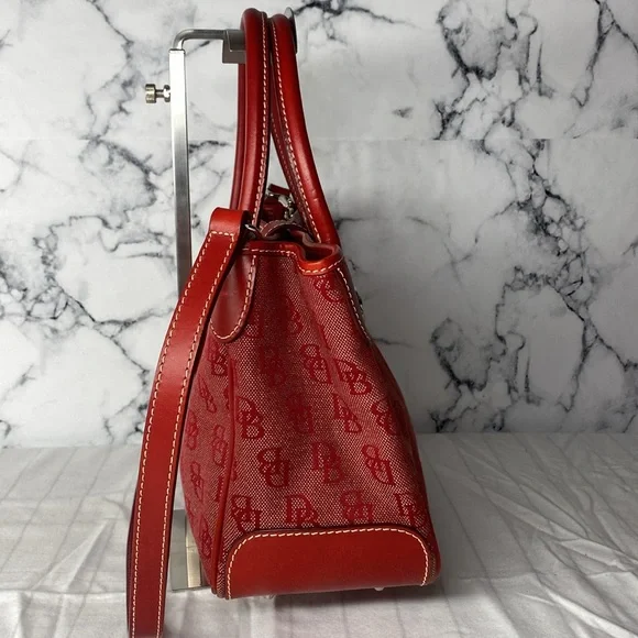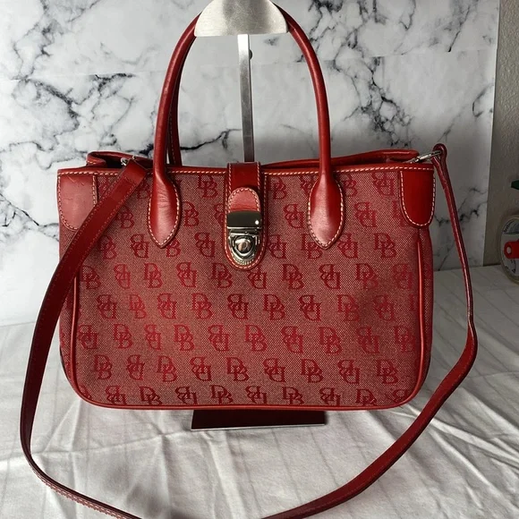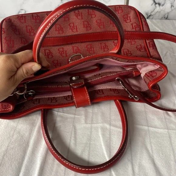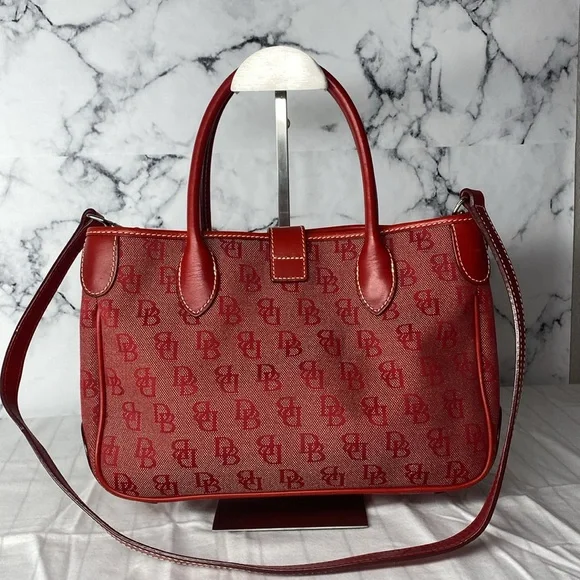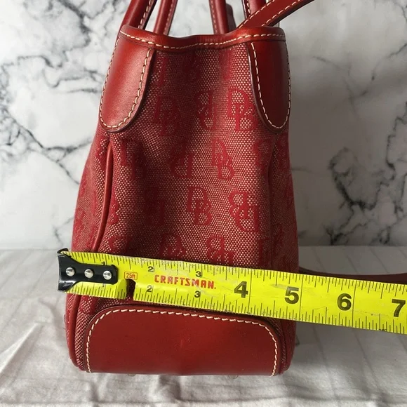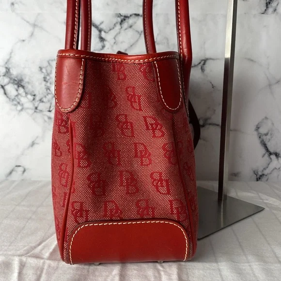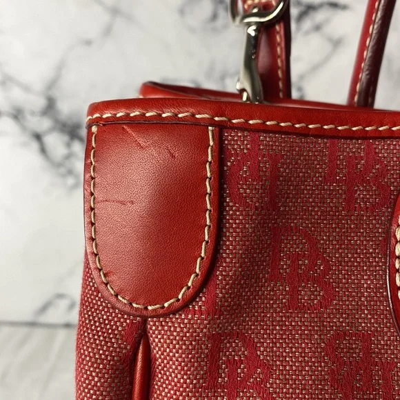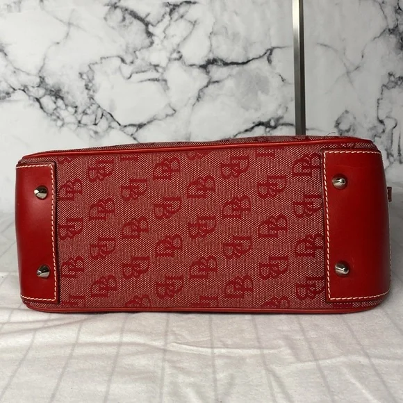 Elegant red designer handbag with signature logo pattern. Perfect for adding a touch of luxury to any outfit.Dooney & Bourke Red Designer Handbag, Red Canvas & Leather Tote bag,Detachable shoulder strapLeather and canvasThick and durableMultiple pockets5 inside pockets Perfect condition 2 minor Scratches see pictures Other than that perfect condition very clean inside and outside