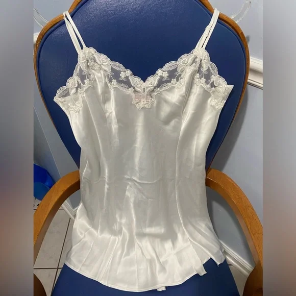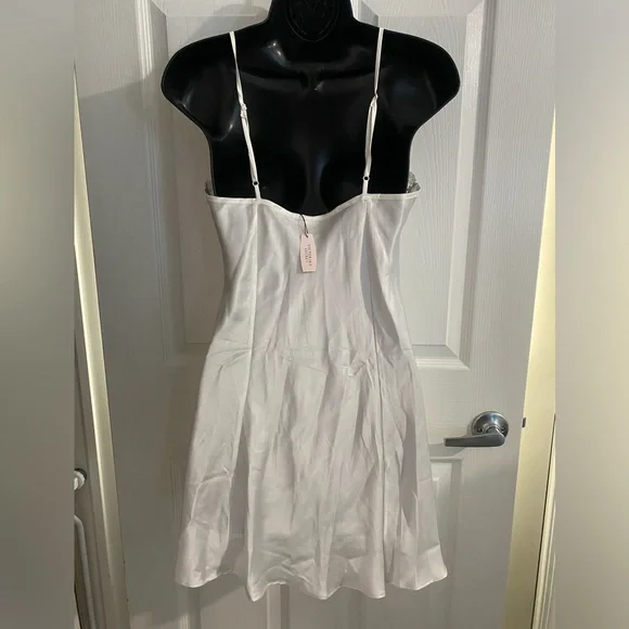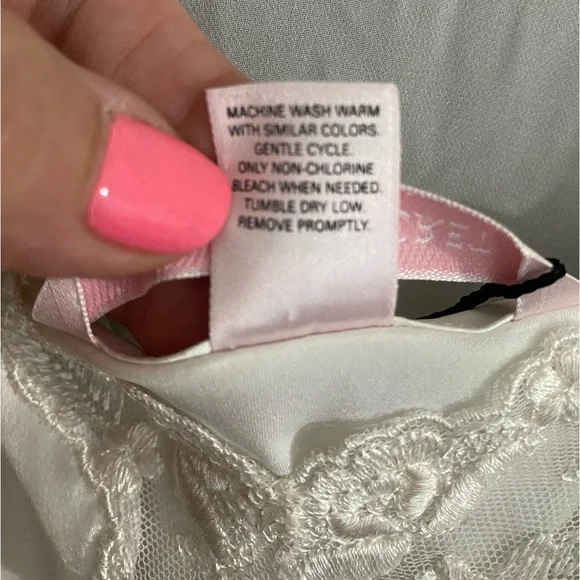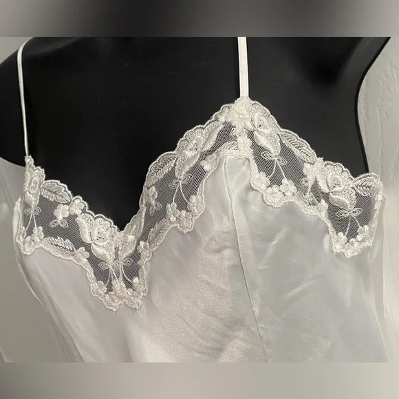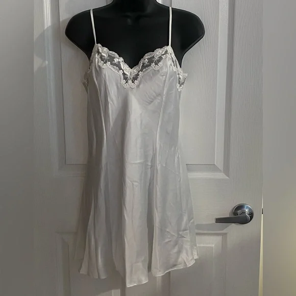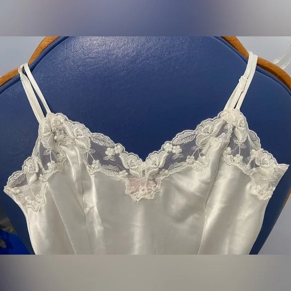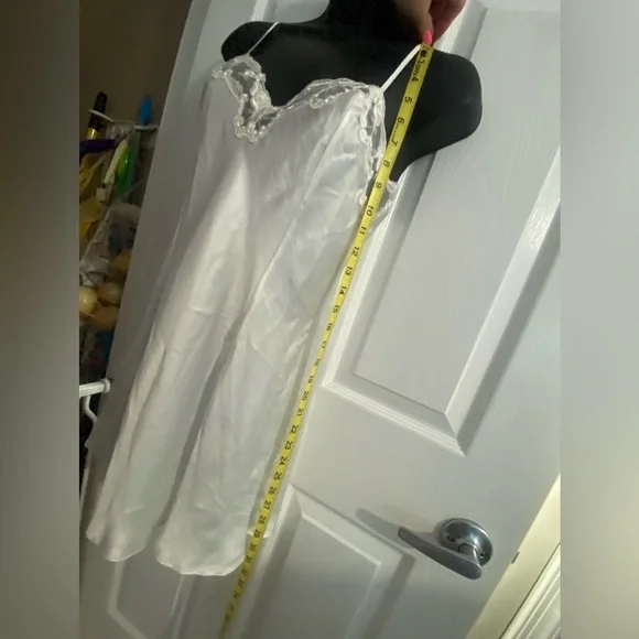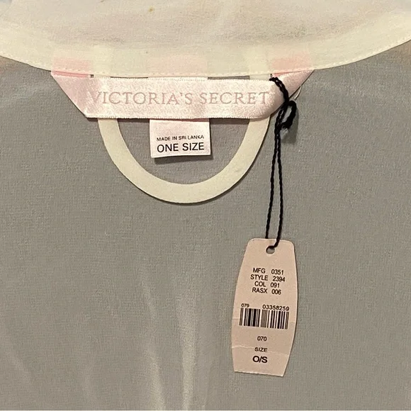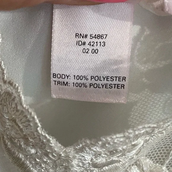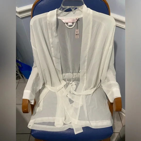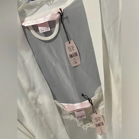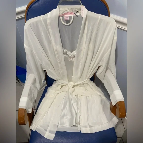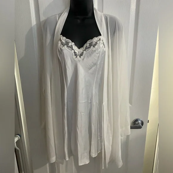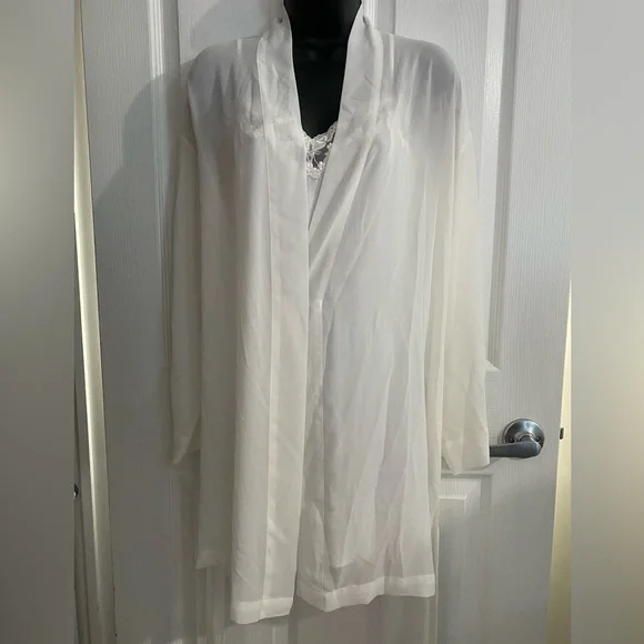 100% polyester, made in Sri Lanka white short robe with subtle and sexy front left leg slit, adjustable spaghetti straps, and delicate sheer lace details across top front; 30 inches from top shoulder to bottom; size SmallMatching long-sleeved sheer robe with side pockets and attachable belt as well as interior tie; One sizeMachine-washableRN 54867New with tags on both