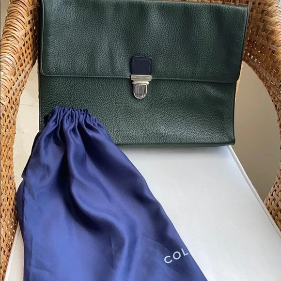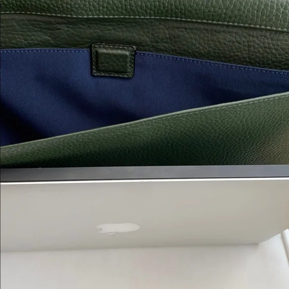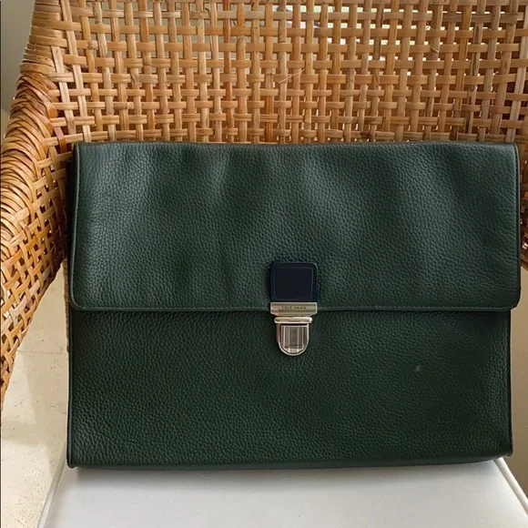 This is a clean look bag made for the modern man. A timeless style, this sport leather brief has space for all workday essentials. The organized interior, fully lined with navy blue fabric, two multifunction open pockets and plenty room to hold a 13” laptop. Secured with a push lock closure in the front and extra pocket with magnetic closure in the back. Carry it by hand.Excellent condition and super clean.Color: Dark Green - Blue interiorIncludes original dust bag in blue