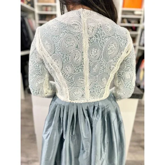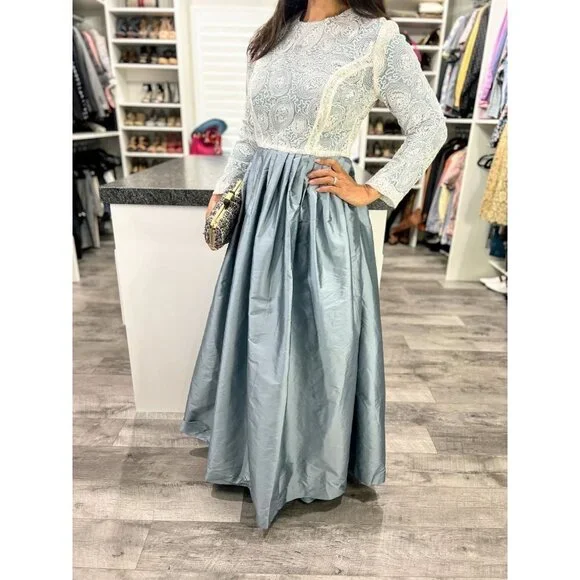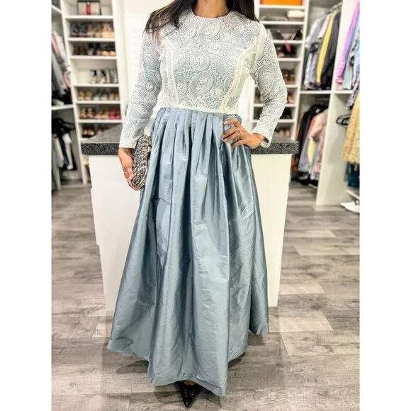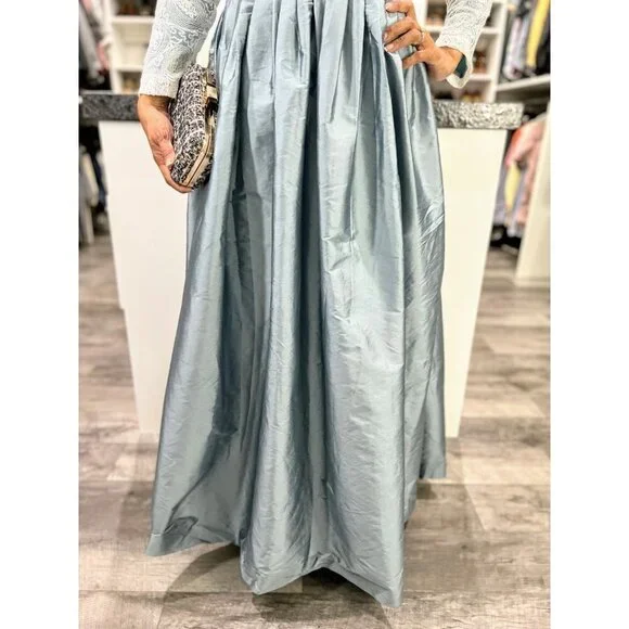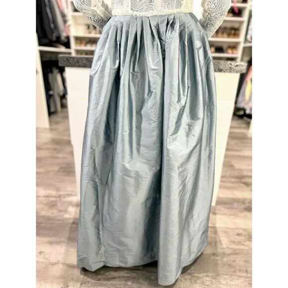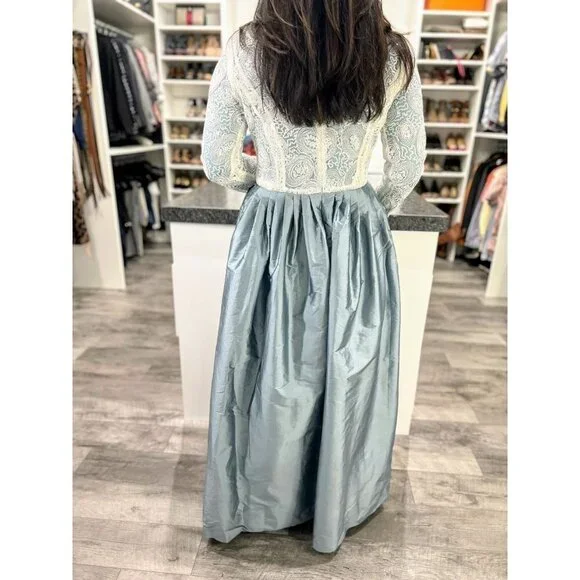 Designer: DesignerSize: MediumMSRP: $999I bought this from a large online retailer who has to remove size and brand tags on high end brands (Balenciaga, Burberry, Giambattista Valli, etc.) as an agreement to be able to sell the item.I wish I knew what the designer is!But this is a top end, beautiful gown that would be perfect for a mother of the bride or mother of the groom.This is truly unique, not like a dress off the rack!Back zip closure, lined.Size estimated as Medium (would fit street size 6-10, per the measurements below).Condition: Excellent - no tears, rips, holes.Left side of skirt below waist has small marks as shown in the photo, but largely hidden with the body of the gown!Measurements Laying Flat (in inches):Length: 58Bust: 17Waist: 14Hips: 18