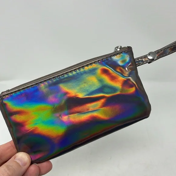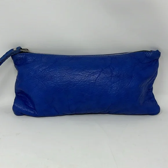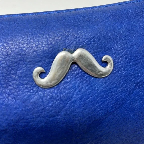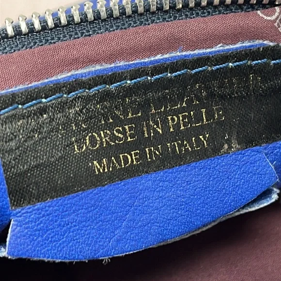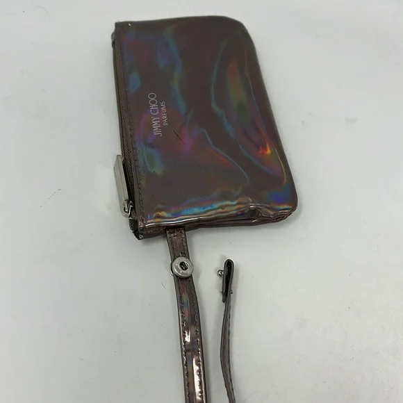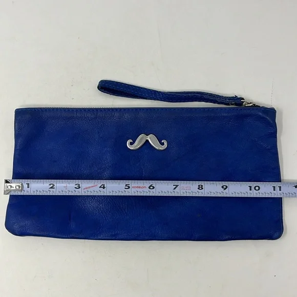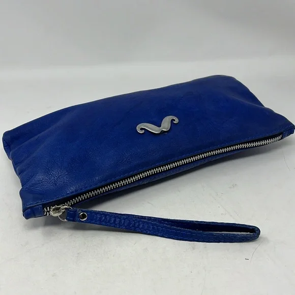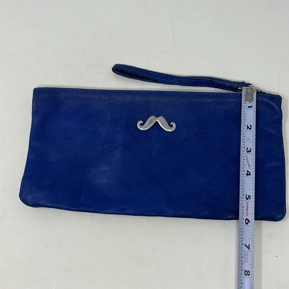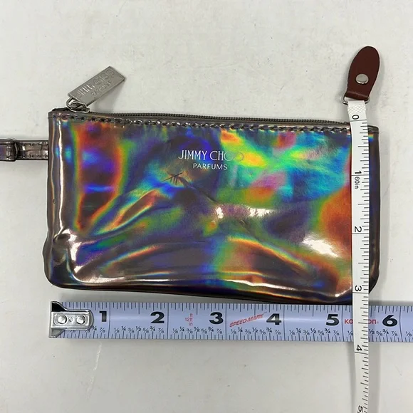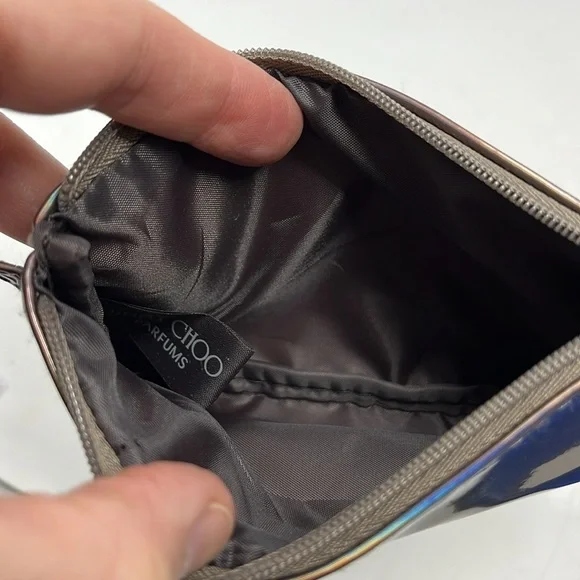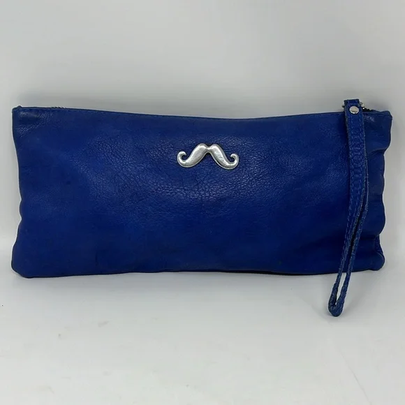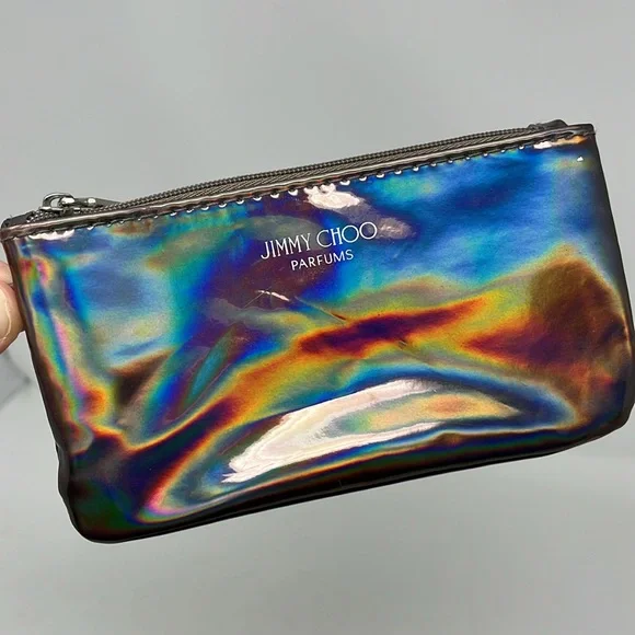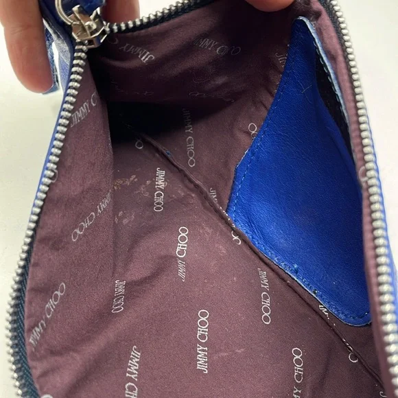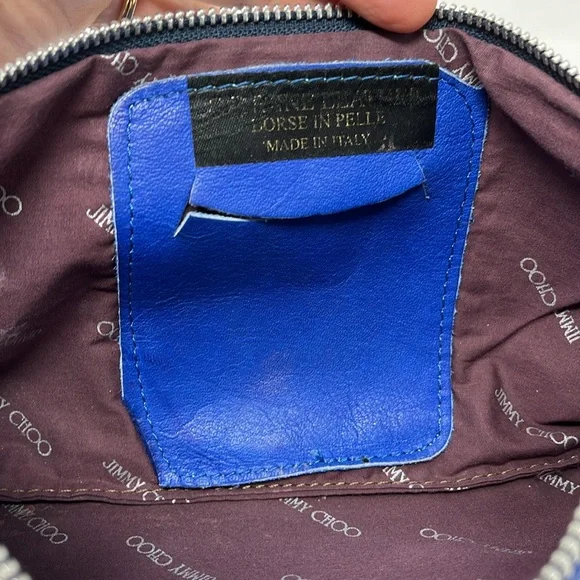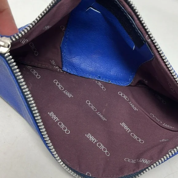 Good preowned and very unique clutch bag from Jimmy Choo and Borse in Pelle genuine leather.Buttery soft royal blue leather with silver mustache on the front.Inside has a little bit of wear but Jimmy Choo on the fabric with blue slip pocket.ALSO, is this little zipper pouch from Jimmy Choo parfums.Iridescent exterior and snap on the handle strap.Thanks for looking and happy Poshing!Make an offer!Bundle items for a discount!Pet friendly smoke free home.