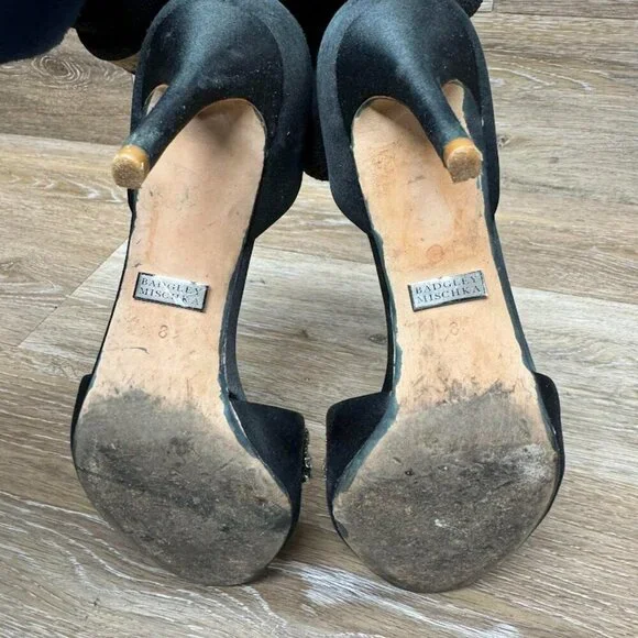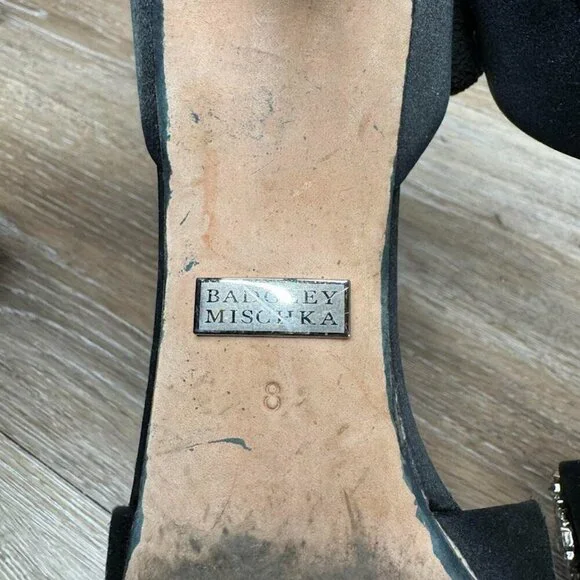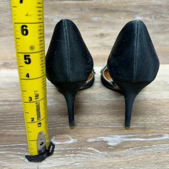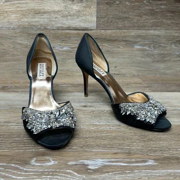 Elevate your shoe collection with these stunning Badgley Mischka Maria Embellished D'Orsay Black Pumps. These pumps feature a peep toe design and a slip-on closure for ease of wear. The high stiletto heel measures between 3-3.9 inches, adding the perfect amount of height to any outfit. The leather outsole and a combination of leather and textile upper material provide durability and comfort. The crystal embellishment on the toe of the shoe adds a touch of glamour to this stylish piece. These pumps are perfect for any occasion and are a must-have for any fashion-forward woman's wardrobe. Add these pumps to your collection today and step out in style!