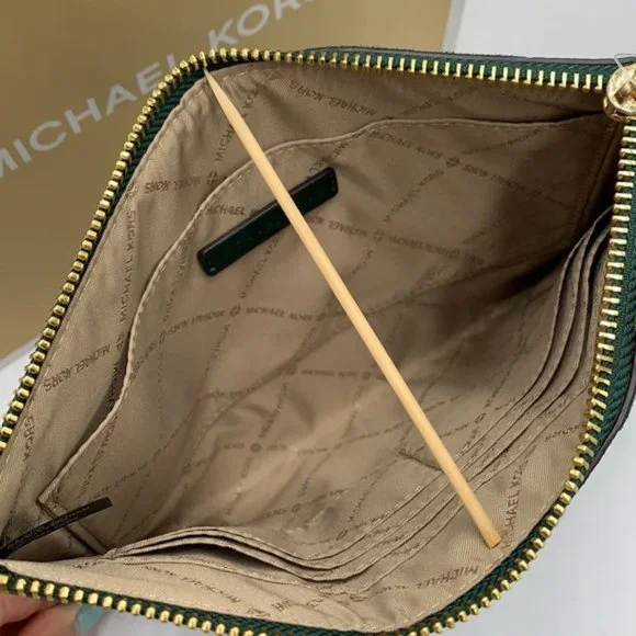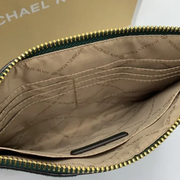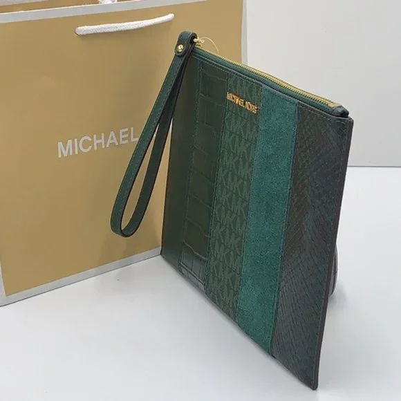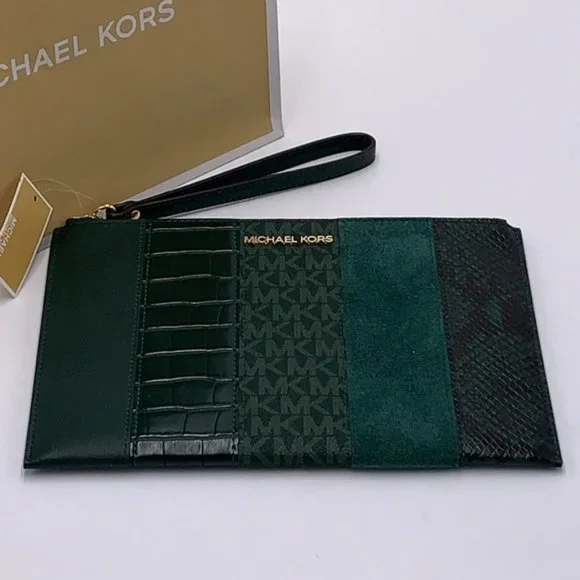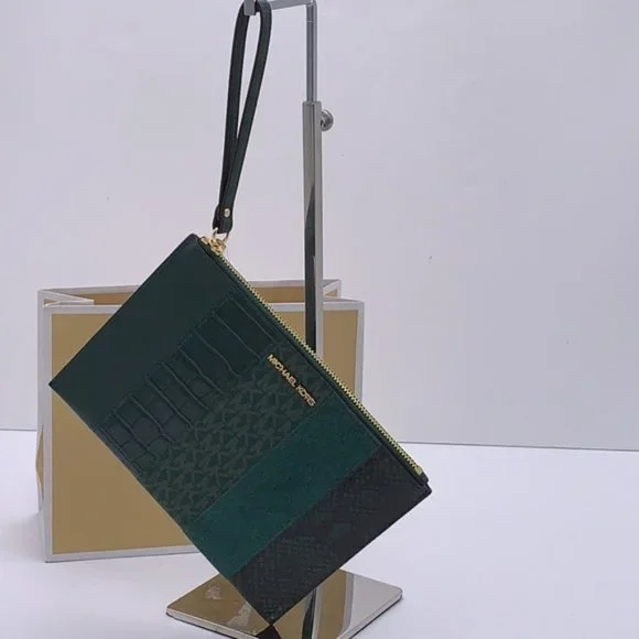 Michael Kors JST XL Zip Clutch Wristlet - Racing Green Multi 100% Authentic Michael Kors !!• Color - Racing Green• Gold tone hardware• Zip Closure• Fabric lining• 1 Slip in pocket• 6 Cards Slot• Dimensions: 9.5” L x 6.5” H x 0.5” D• Strap 6.5”• Material: Leather ,PVC• UPC # 194900659533** 2 Colors Available to choose .Merlot Color