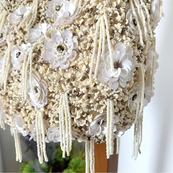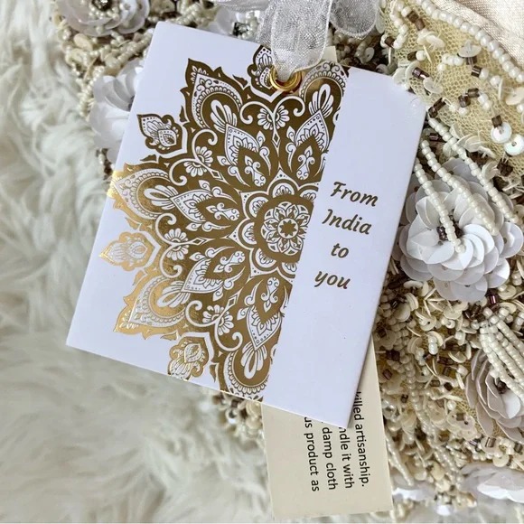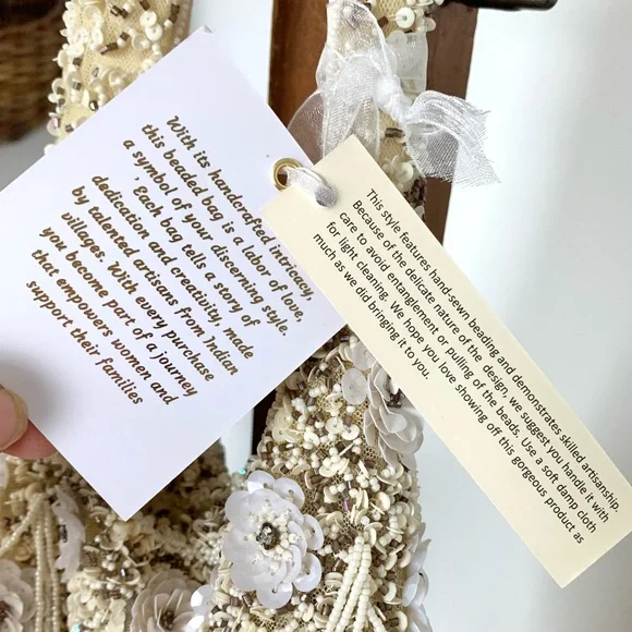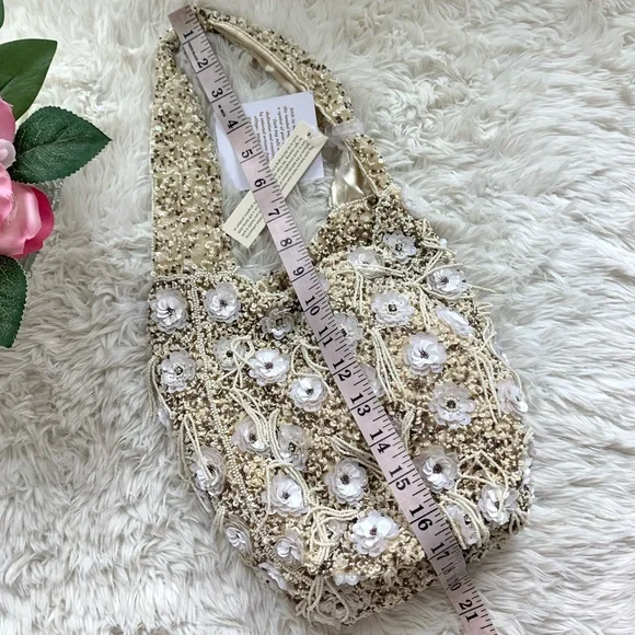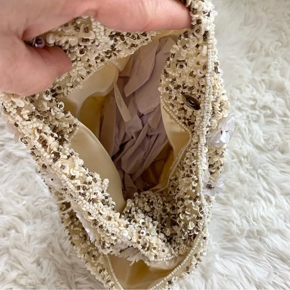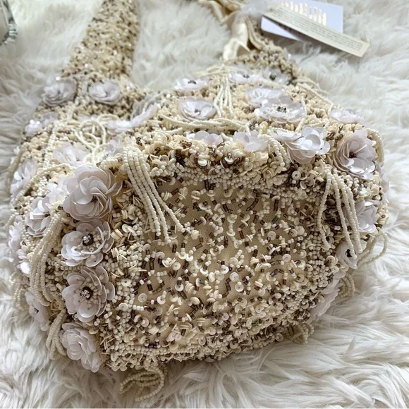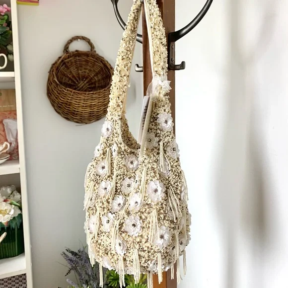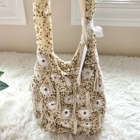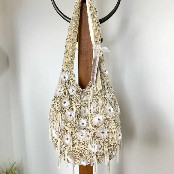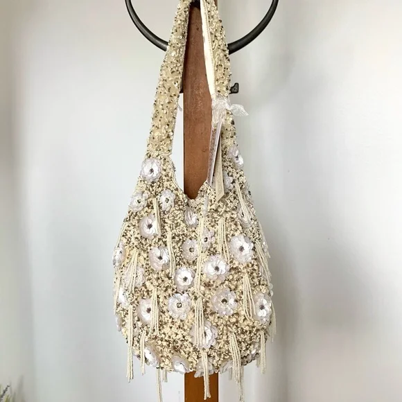 NEW WITH TAG Viral Tik Tok White Cream Bridal Floral Beaded Fringe Bag Made in India Bohemian Wedding NWTThe Viral beaded Bag everyone is talking about!Made in IndiaBeautiful white cream hand-sewn beading!White floral detail Satin lined Snap closure Approx measurements laying flat:17” total length x 9” x 4” deepHandle drop 8”Tags:Hobo mini tote boho HTF Rare Anthropologie Free People Wedding gala cocktail bride feminine romantic embroidered embellished handbag evening engagement party Spring Summer special event Staud NWT hard to find mini bag