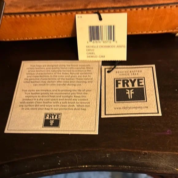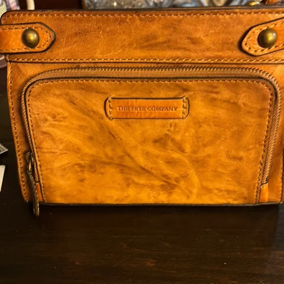 Stylish Frye messenger bag in premium leather. Features a rich tan color. Ideal for daily use.It’s 8 1/2 inches wide and 6 1/4 inches tall. It has 2 big slot pockets, 1 zippered compartment and 1 large zippered pocket on the outside perfect for a phone.Also there is a key fob attached on the inside. It is in mint condition. No stains inside or out.