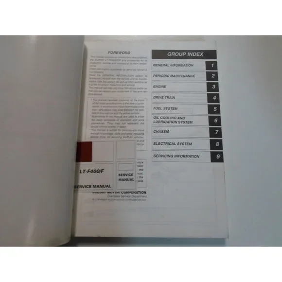 2002 SUZUKI LT-F400/F SERVICE MANUAL LT-F400K2/400FK2 MINOR WEARP/N: 995004305003ENote:Service manual has very minor wear on the front back cover. Over all the manual is in good legible condition.See Photos.Loads of information and illustrations, covers a lot, step by step Instructions, exploded illustrations and/or diagrams, great manual to have when you own a SUZUKI LT-F400/F. This manual will save you money in Repairs/Service.This manual is published by SUZUKI, and are the same manuals the SUZUKI Mechanics/Technicians use.if you have further questions feel free to message us or call us @ FEEDBACKWe will leave POSITIVE Feedback after we receive your payment. Please do not forget to give us POSITIVE Feedback and FIVE STARS on all of the Detailed Seller Ratings!If you are not satisfied with your shopping Experience, please contact us to get a solution before you decide to leave a NEUTRAL or a NEGATIVE Feedback, We will do our best to solve any problems for you as soon as possible.We will provide you with the BEST POSSIBLE service because the POSITIVE Feedback and FIVE STARS are what we are striving for. Please email me through "My Messages" or "Ask Seller Questions" if you have any question about our listings or your purchase.Please give us Five Star Rating! Thank you very much!KCTrack Page Views WithAuctiva's FREE Counter