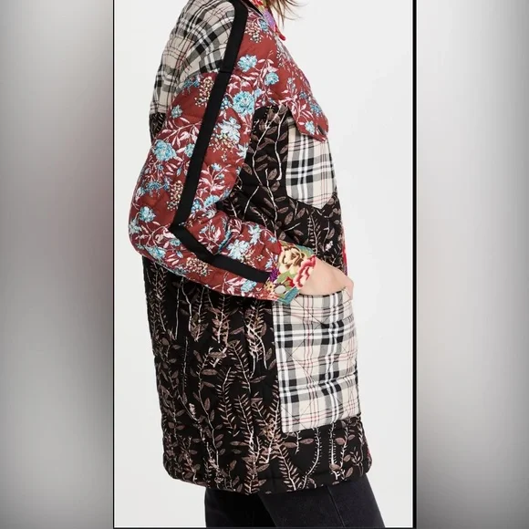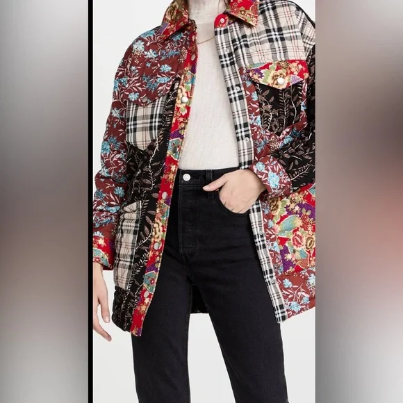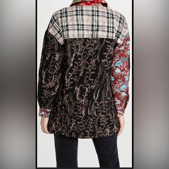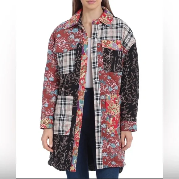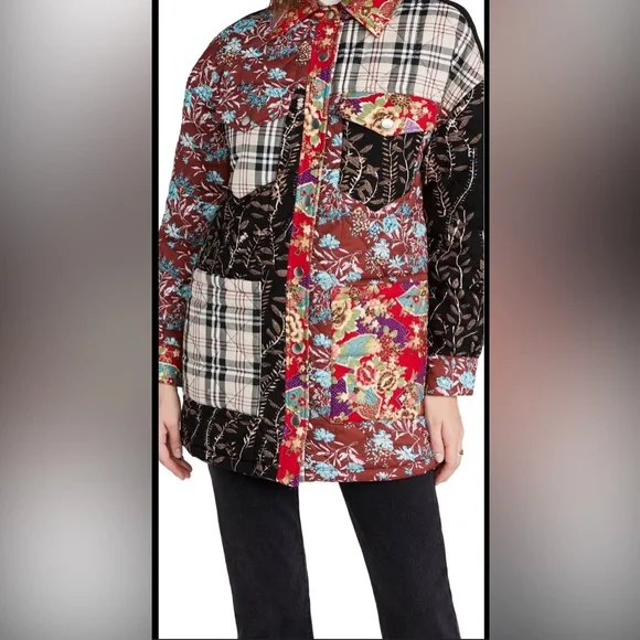 Anthropology AVEC LES FILLES Patchwork Quilted Shirt Jacket Size XS Red Black MultiThe Anthropologie AVEC LES FILLES Patchwork Quilted Shirt Jacket combines cozy comfort with a chic, bohemian aesthetic. Featuring a patchwork design of complementary prints, this versatile layer exudes effortless charm. The quilted texture offers warmth and structure, while the relaxed fit ensures all-day comfort. Complete with a classic button-down front and functional pockets, this jacket is perfect for layering over casual outfits or adding a stylish touch to your wardrobe. Dress it up with boots and jeans or keep it casual with leggings and sneakers—this statement piece adapts to any look.A playful patchwork design lends a quilt-inspired look to this shirt-style jacket from Avec Les Filles.Point collar; button-front closuresTwo patch pockets at chest and hipsLinedShell 1: cotton/rayon; shell 2, fill: polyester; shell 3 & 4: cotton; lining: polyester/cottonDry clean