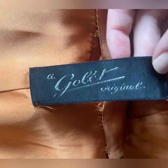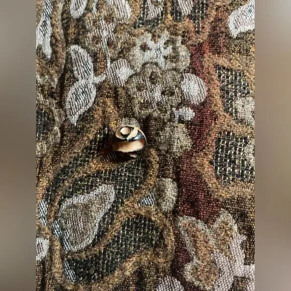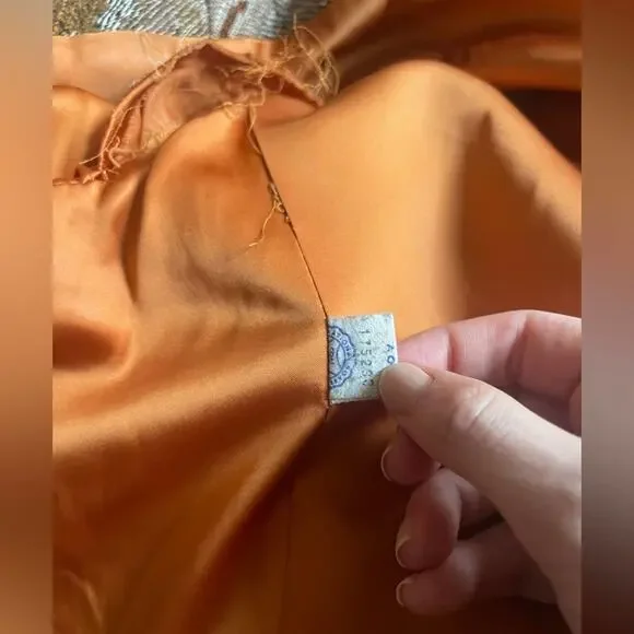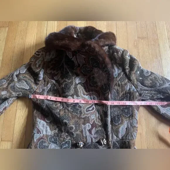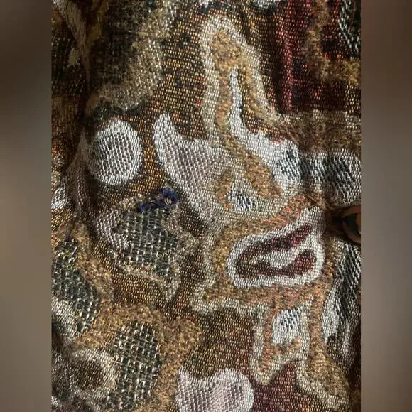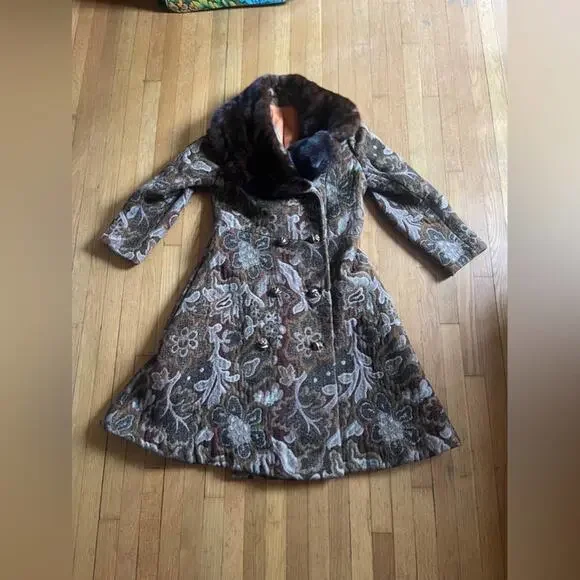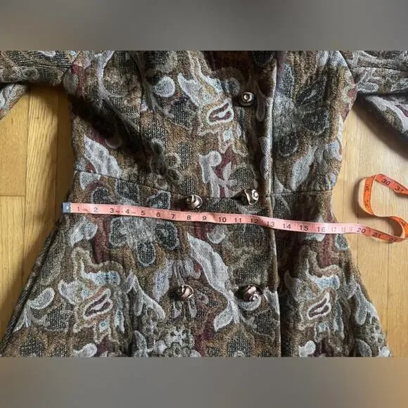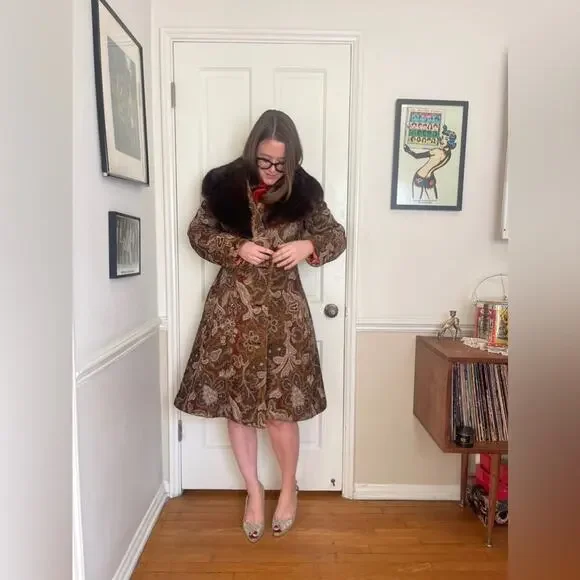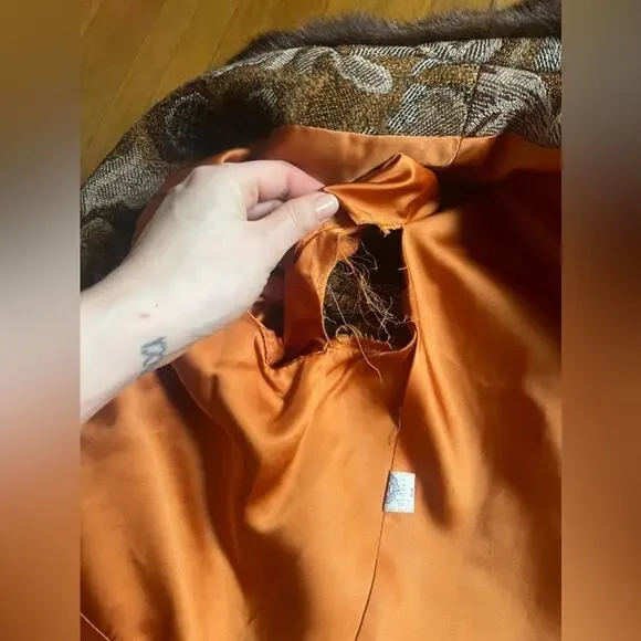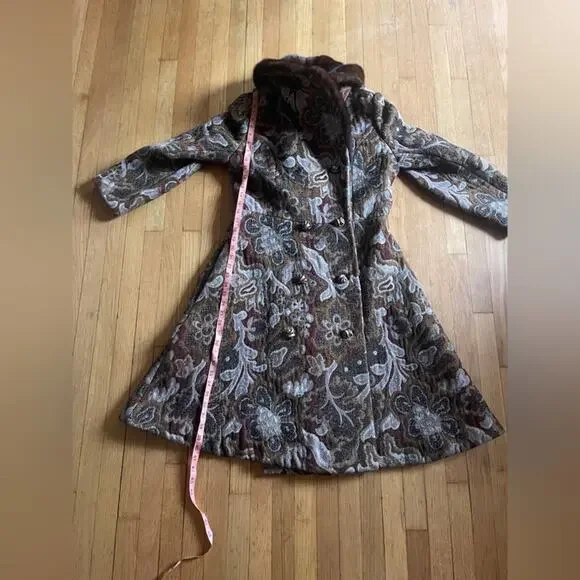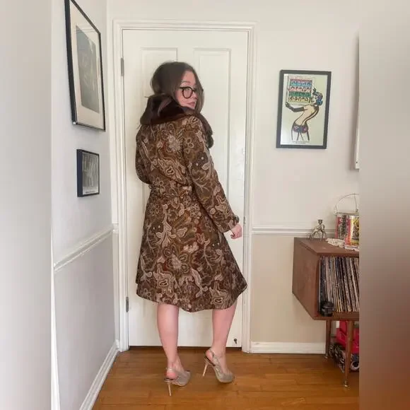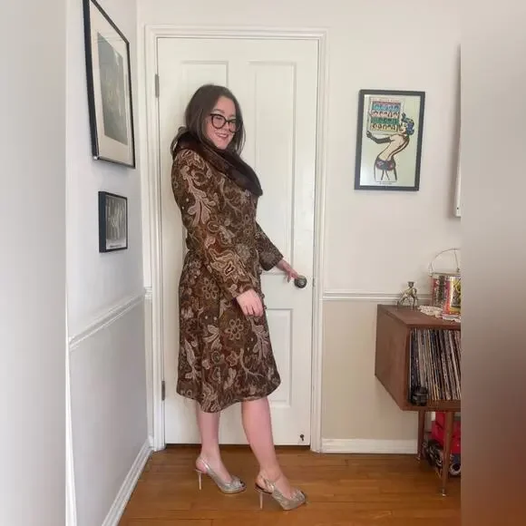 This coat is to die for! circa 1960s, it’s a princess a line cut tapestry jacket with a dark fur collar. The coat is a floral tapestry in various shades of browns, grays, and tans.It’s got double breasted large buttons and is lined with orange silk/ satin. Has both an interior union tag and brand tag - it is made by golet originals.No size tag - measurements in line with a medium. Overall in good vintage condition - interior lining is torn near the arm opening - see pics. It’s also missing a top decorative button, but this is hidden by the collar.
