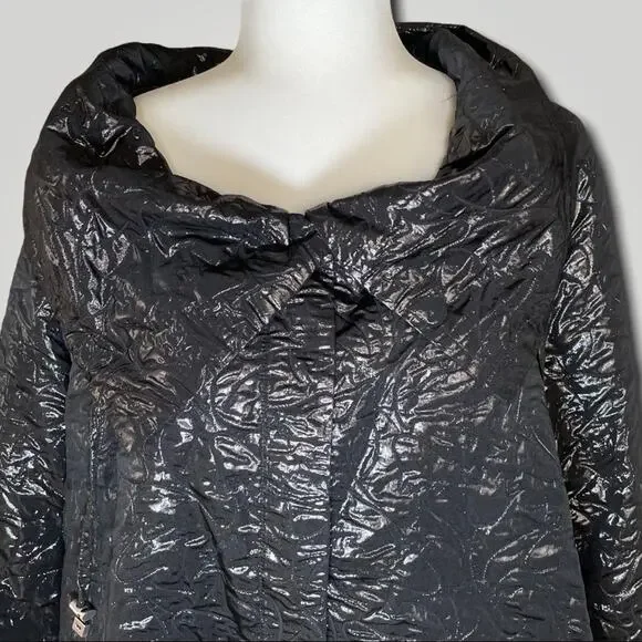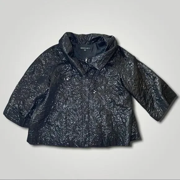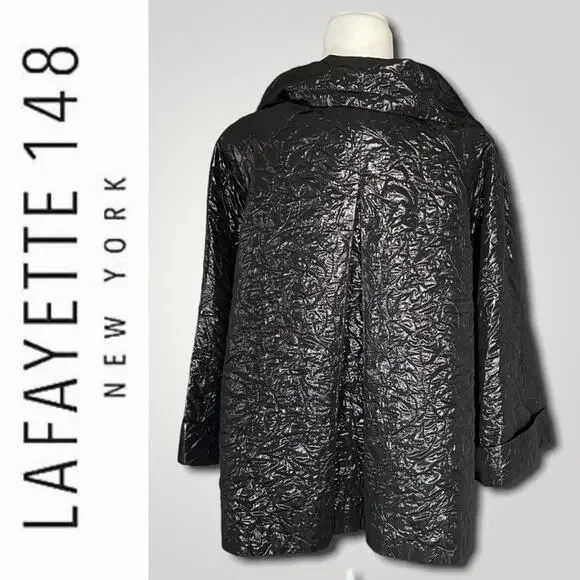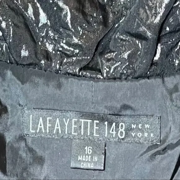Lafayette 148 60s-Inspired Metallic Cocktail Jacket - Black - Size 16Size: 16Color: Metallic BlackStep into the spotlight with this Lafayette 148 Statement Jacket. Radiating vintage 60s mod vibes, this piece combines timeless elegance with a contemporary edge. Whether you're dressing for an evening soirée, cocktail party, or formal event, this jacket will have you channeling your inner Jackie O with modern flair.• Design: Bold portrait/Peter Pan collar for a retro-modern statement.• Sleeves: Cuffed 3/4 length, adding a chic touch.• Material: Metallic black fabric, perfect for catching subtle light.• Versatile Style: Ideal for black-tie events, cocktail parties, or any occasion where sophistication meets statement-making fashion.Condition: Excellent, like new pre-owned condition—ready to impress.Measurements: See photo for approximate flat lay details.Chest: 24.5"