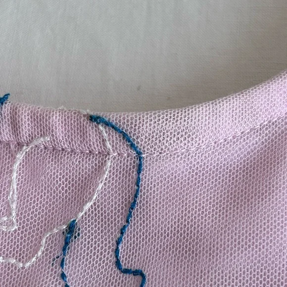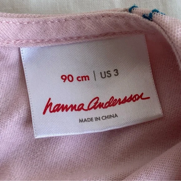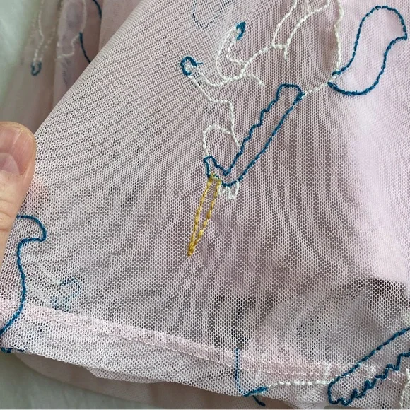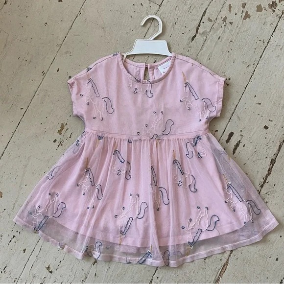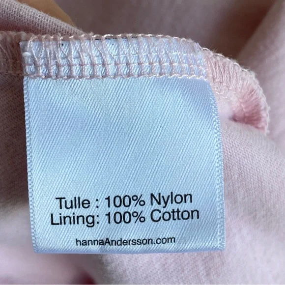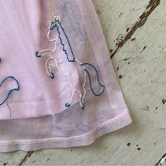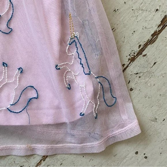 Pink Tulle Dress - Embroidered Unicorns on NettingBrand: Hanna AnderssonNylon TulleNetting - Cotton LiningKeyhole button closure in backSize: 3Please refer to approximate measurements taken lying flat, double for circumference:chest: 12 1/2"length: 19"It in in great pre-owned condition with someminor dirt on collar and a couple of pics in netting- see pics
