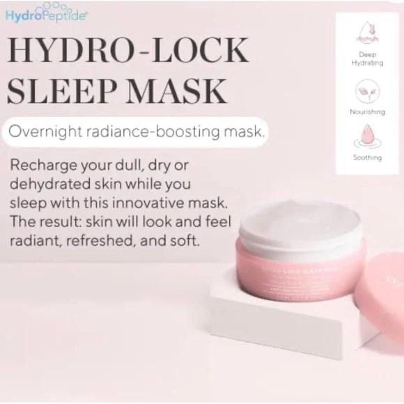 HydroPeptide Hydro-Lock Sleep MaskOvernight, pillow-proof treatment that smooths and perfects your complexion, boosts cell turnover and infuses your skin with radiance-restoring ingredients.Recharge your skin while you sleep and up to a deeply nourished, softened, and smooth complexion.RESULTS+Deeply hydrates skin overnight+Encourages healthy cell turnover+Protects and brightens the appearance of skin over timeKEY INGREDIENTS +Licorice RootProvides protective antioxidant benefits while giving the look of brighter skin+HydrO18™ Activated WaterPatented formulation that creates "smart" water shown to increase skin hydration and improve skin's retention of water.+Royal Jelly PeptideMimics royal jelly to stimulate cell renewal and help skin create healthier cells.🎁 Bundle with FREE items 🎁