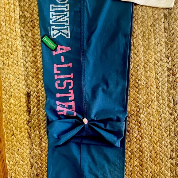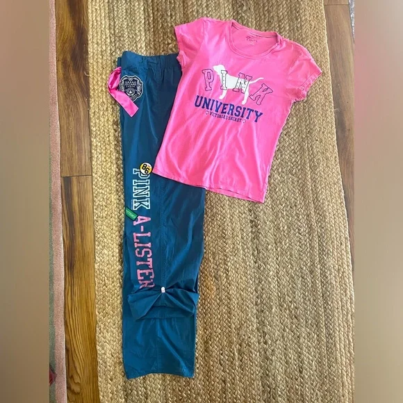 Set was worn ONCE!Get ready to rock some serious vintage style with this Victoria's Secret pink pajama set in XS/S size. This set is perfect for college-inspired sleepwear and features a long-sleeved top and pants with snap and tie. closure. The blue and pink color combination is sure to turn heads and make you feel feminine.Made of a comfortable cotton blend, this pajama set is perfect for those cozy nights in. With its vintage look, it's sure to become a favorite in your sleepwear collection. Don't miss out on this must-have item for any woman's wardrobe.Pants can be worn down or rolled up!Pants are size XsTop is size Xs/S