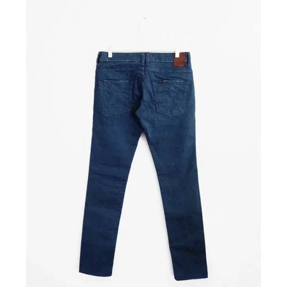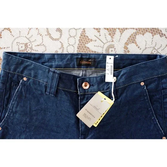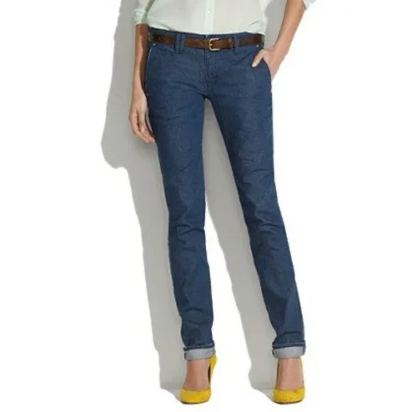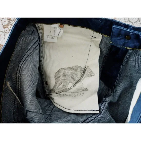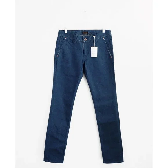 Chimala Smoky Blue Denim Low Rise Slim Stretch Trouser Jeans size 28, new with tags, made in Japan, style no. CS14-WP08A smoky blue slim stretch pants, madewell style# 21972, mid rise but sits on low to mid waist, front zip, five pocket styling, slant seam hip pockets, slim fit, tapered leg, muted blue stretchy twill weave denim self, 95% cotton, 5% polyurethane, 16" across waist, 8.75" front rise, 19-19.25" across hips, 10.75+" across thigh, 32" inseam, 13" leg opening