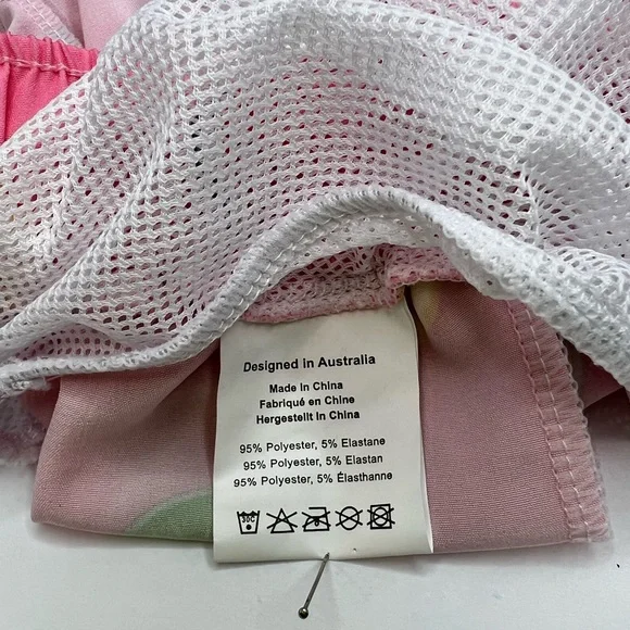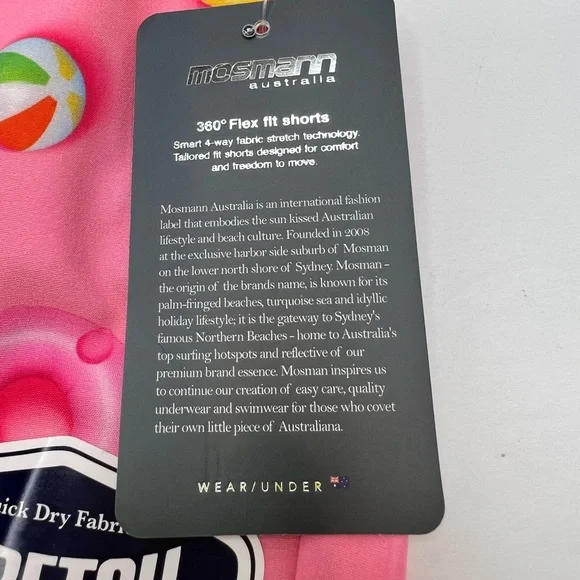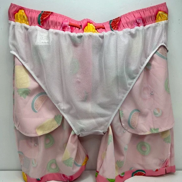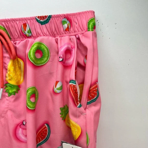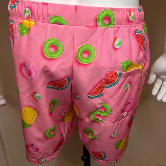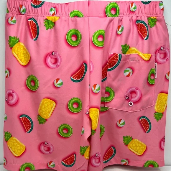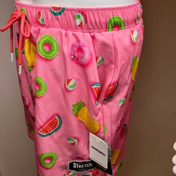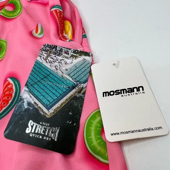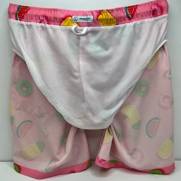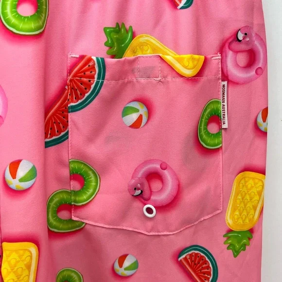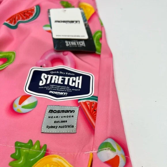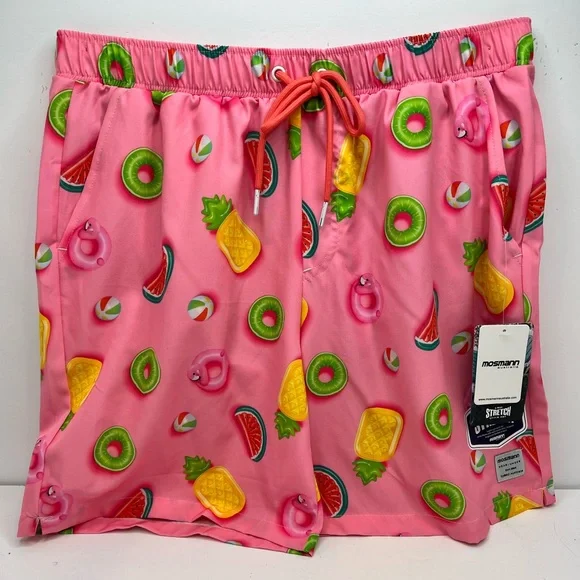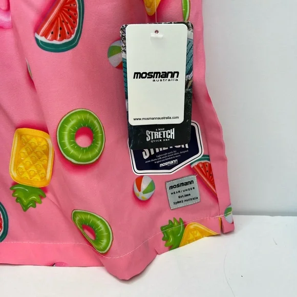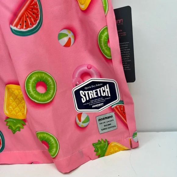 MOSMANN AUSTRALIA BATHING SUIT, TRUNKS, PINK BASE W/TROPICAL FRUITS, 360 STRETCH. Brand new, never used. Original tags attached . Authentic and real product . The size is LARGE (L). Super fun bathing suit, pink base with tropical fruits. 360 degree stretch . Amazingly comfortable. It has an inner mesh for support of boys