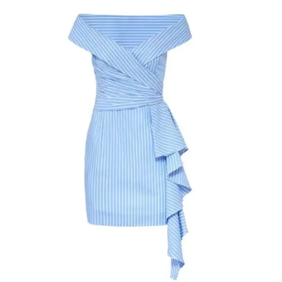Fame and Partners The Ise Dress in Blue and White Stripe Size 2 USFlirty off-the-shoulder styling and a cascading side ruffle add feminine allure to this Fame & Partners mini dress in crisp suiting stripes.Blue and white striped cotton (100% Cotton). Sheath with faux wrap detail and ruffle. Short sleeves. Off the shoulder neckline. Hidden back zipper with hook-and-eye closure. Fully lined. 29" from bust to hemline. Imported.
