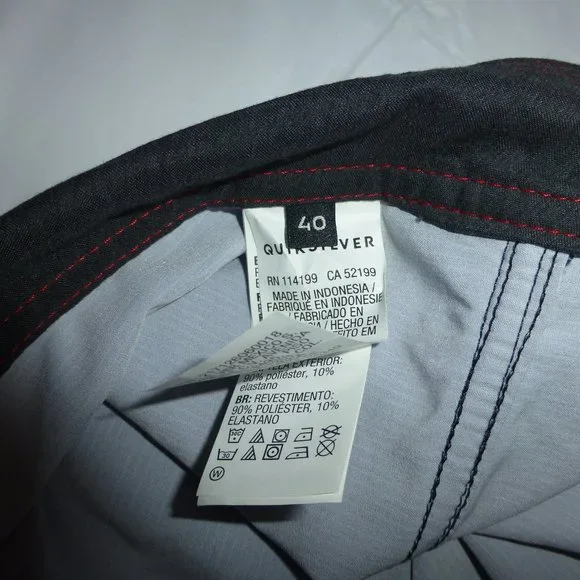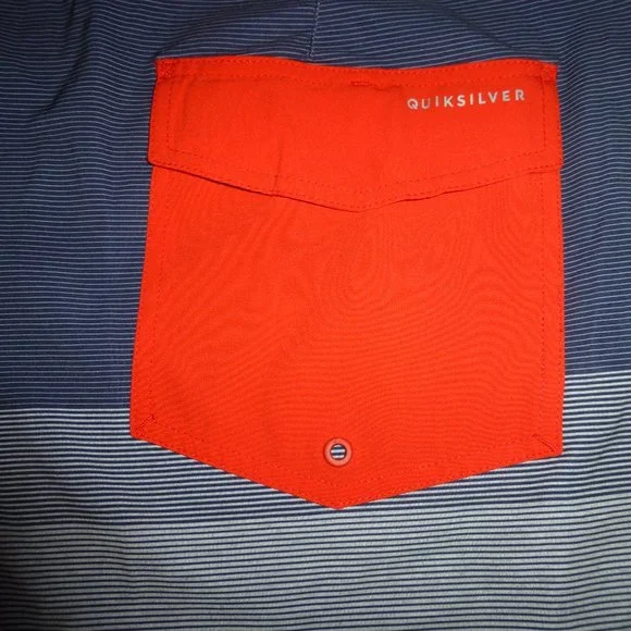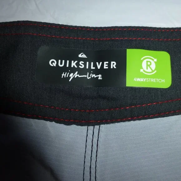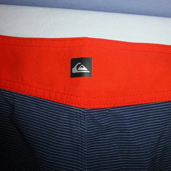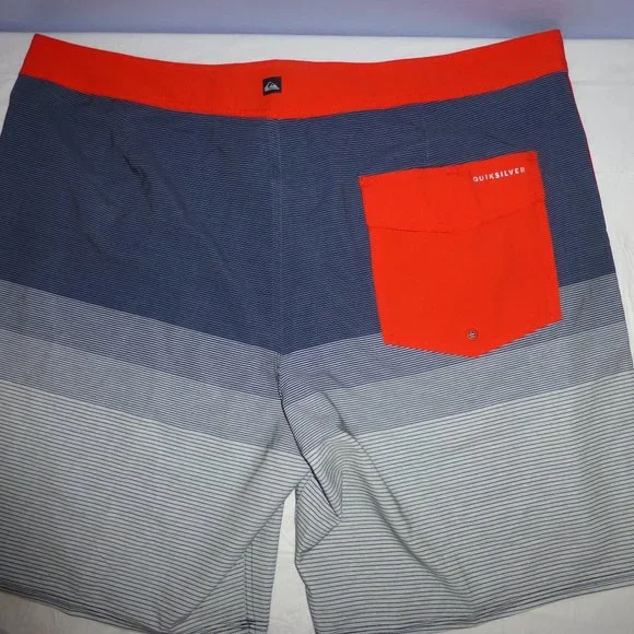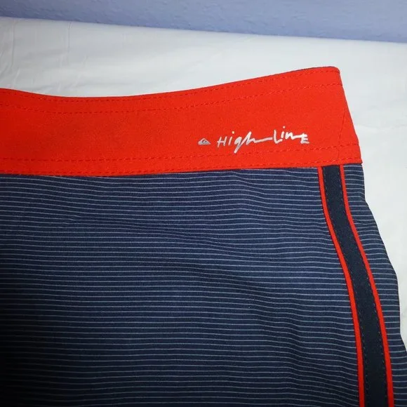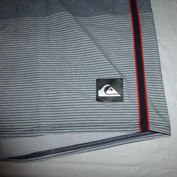 Men's Quiksilver High Line Blue Gray Red Striped Board Shorts Size 40New without tags90% polyester, 10% elastaneBlue and gray striped with red trim and waistRed left rear right pocket with hook and lock flap Hook and lock, string closureExcellent condition, no flawsMeasured laying flat:Waist 20.5" (41")Inseam 8.5"Rise 13"Outseam 20"