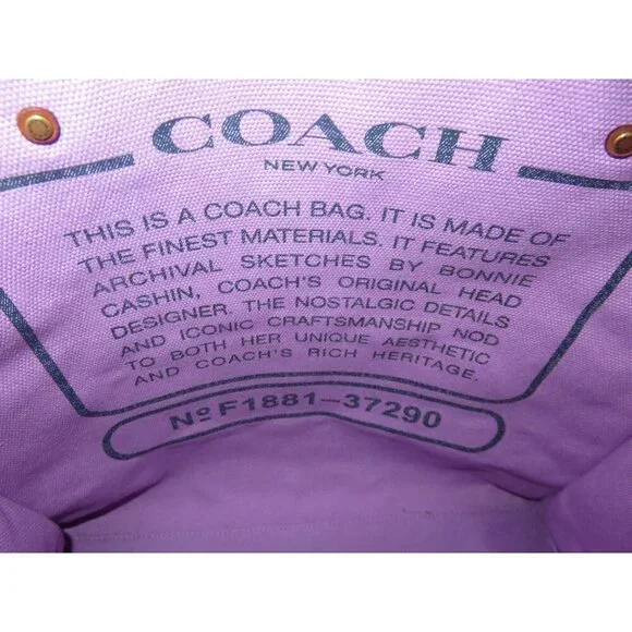 This bag is adorable! I have a lot of Bonnie Cashin totes but this one is one of my favorites with this gorgeous purple (my favoritecolor). 13 1/2" X 14 1/4" X5" / Handles with 9 1/2" dropStyle No. 37290/ Printed canvas with snap closureThis lightweight tote features a print of an archival 1960s fashion illustration by Bonnie Cashin, Coach’s first head designer. Crafted of sturdy canvas printed with our prairie daisy pattern, it secures with a snap closure and has luxe leather detailing.Used but very well cared for!! All used bags may have the following✔️Discoloration✔️cleaning smell (I do not use heavy chemicals, but even natural ones can take a little time to air out)✔️Signs of use✔️Scratches scuffing✔️rubs✔️Pls check the picture closely as it part of the description.
