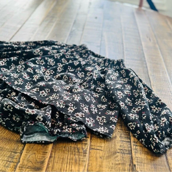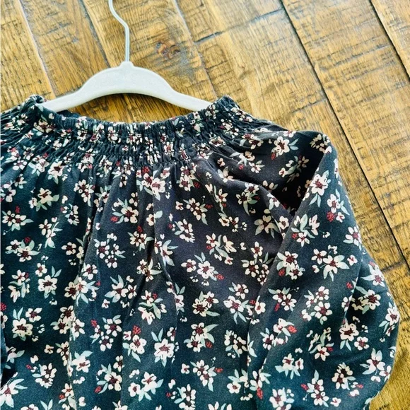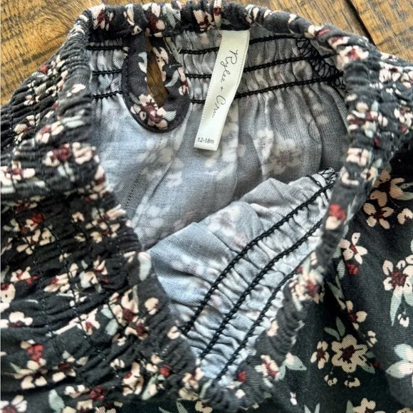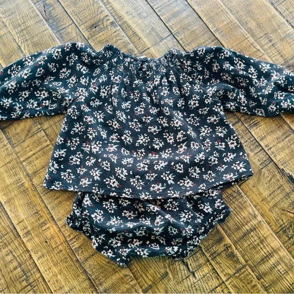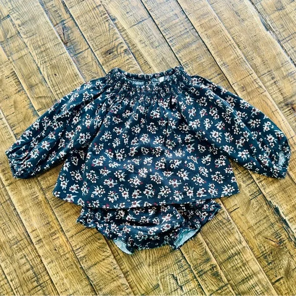 Bought for daughter and she wore it for about thirty minutes. It is very much like new. The base color is charcoal. Happy to answer any inquiries. DescriptionQuincy Set is a blousy long sleeve top with a matching bloomer sold as a set. The top is finished with a keyhole and light coconut button in the back.Featuring our 'dark floral' all-over print.Care: Machine wash cold. Tumble Dry low. Minor shrinkage may occur if tumble dried.Made of 100% Viscose Adorable baby outfit set with floral pattern. Includes a long-sleeve top and matching bottoms. Perfect for any occasion.