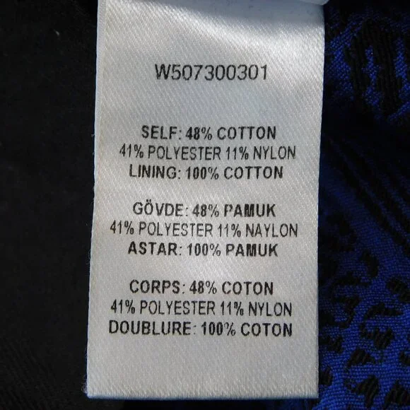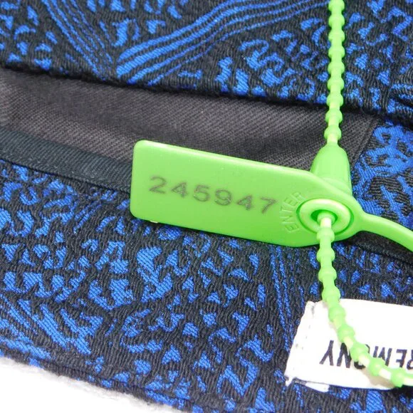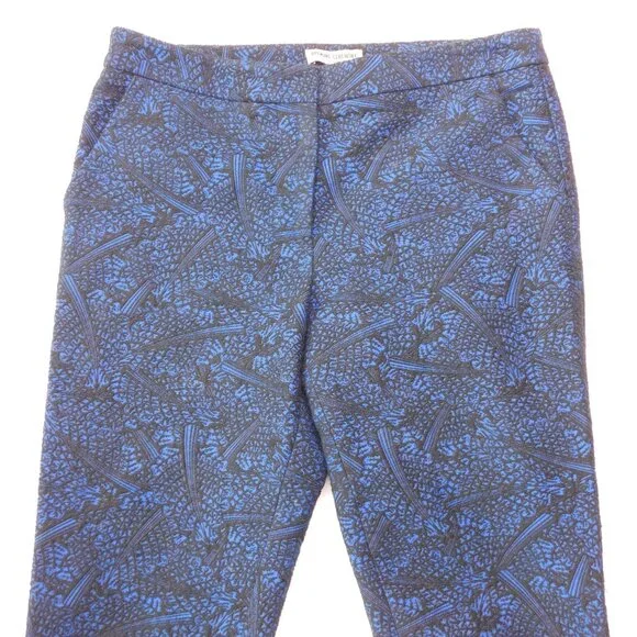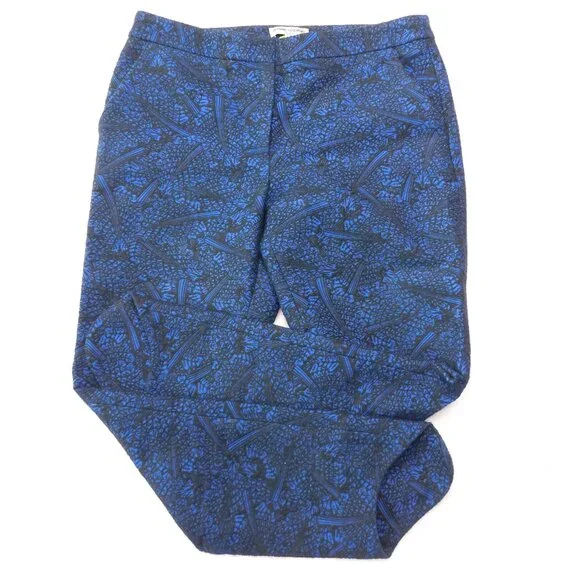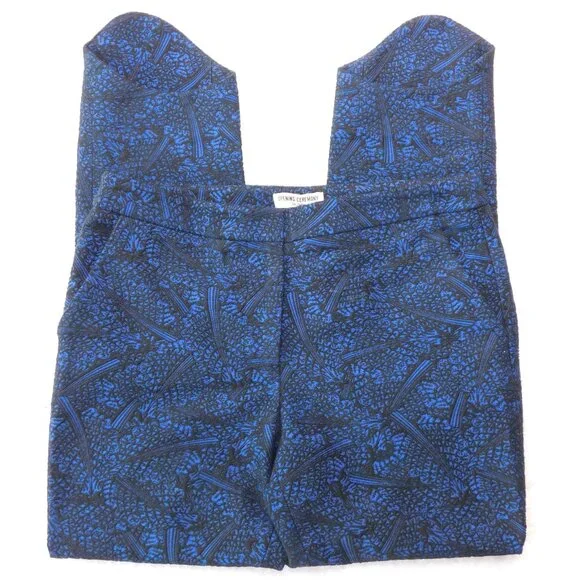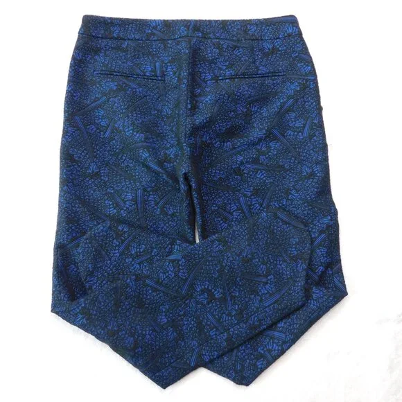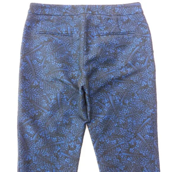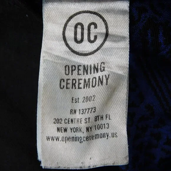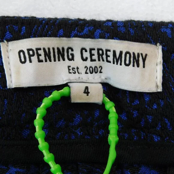 Opening Ceremony black and blue jacquard crop pants. Color: blue current multi. Two slant front pockets. Two back welt pockets. Zip fly with hidden button front and hook & bar closure. Curved hem line.Size 4. Measurements (flat) approx.: 15.5" waist, 10" rise, 25" inseam with 3" additional curved bottom hem. Green toggle on size tag.In excellent used condition.