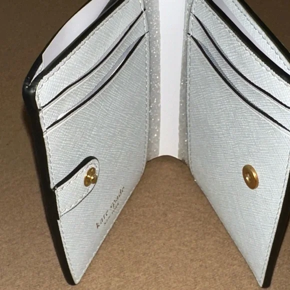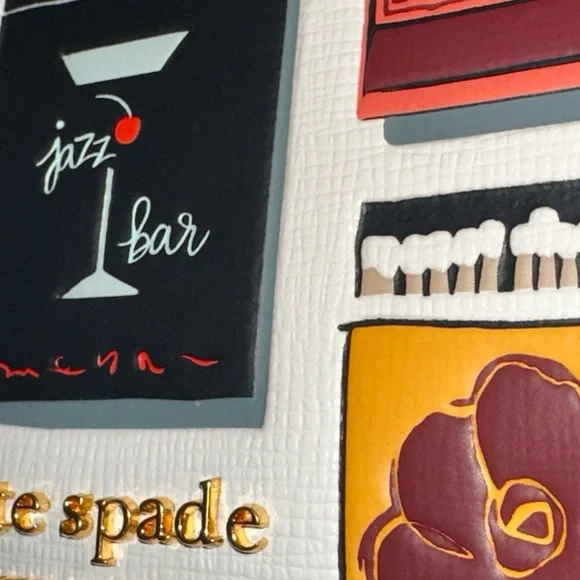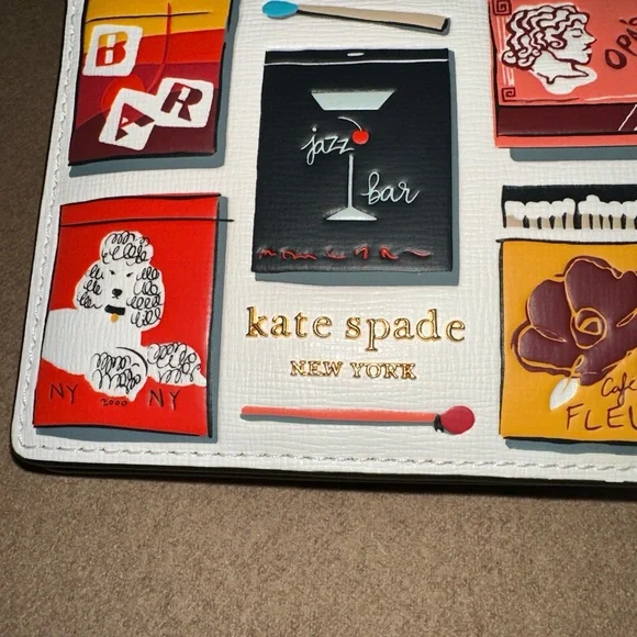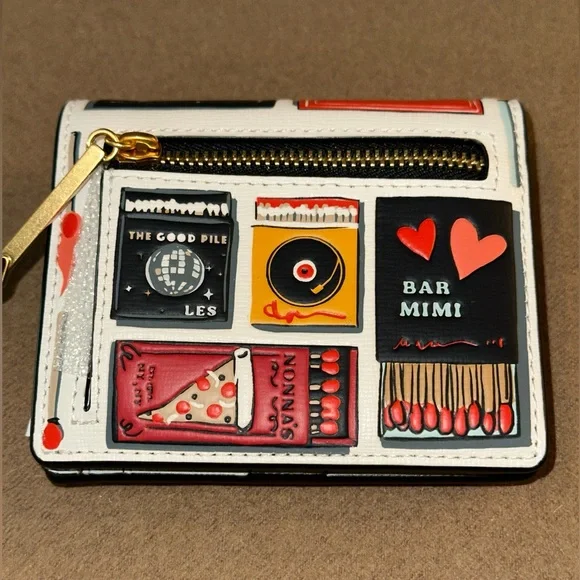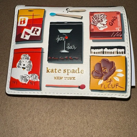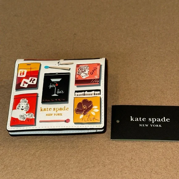 This Kate Spade Morgan Matchbox Small Bifold Wallet is a must-have for any fashion-forward woman. The wallet features a matchbook pattern with a unique jazz character design, made of high-quality leather material with a multicolor scheme. The wallet is perfect for one size and has a matchbox feature that adds a touch of convenience. The wallet is a designer piece from Kate Spade New York, with accents that include the brand's logo. The wallet is not vintage and is not personalized. It is a women's accessory that is perfect for any occasion.MEASUREMENTS3.75"h x 4"w x 0.75"dFEATURESBifold wallet with snap closure4 card slots4 slip pocketsInterior bill slipExterior zip pocketPlaque logoMATERIALSEmbossed Saffiano leatherFaille liningImportedStyle No. KD119