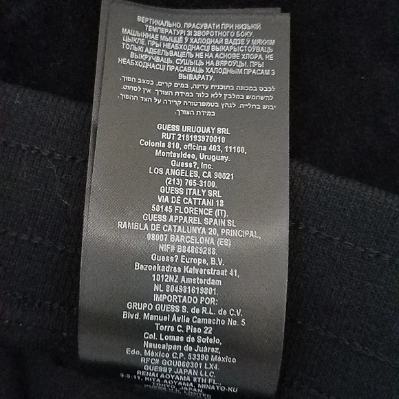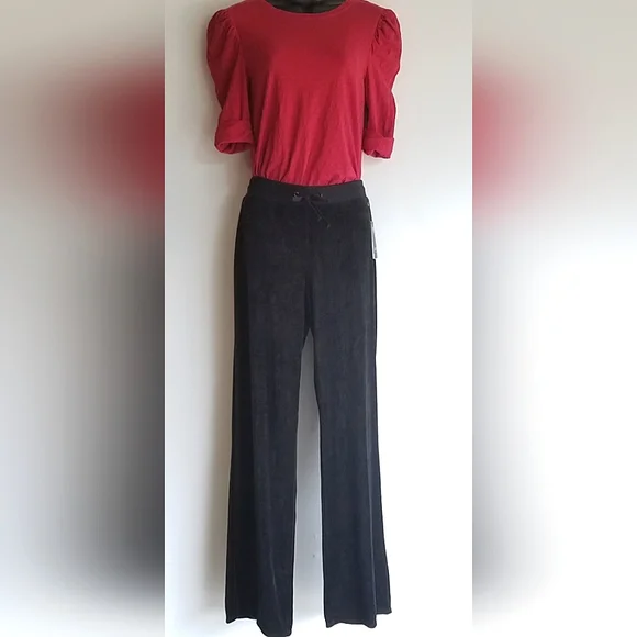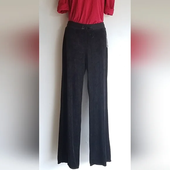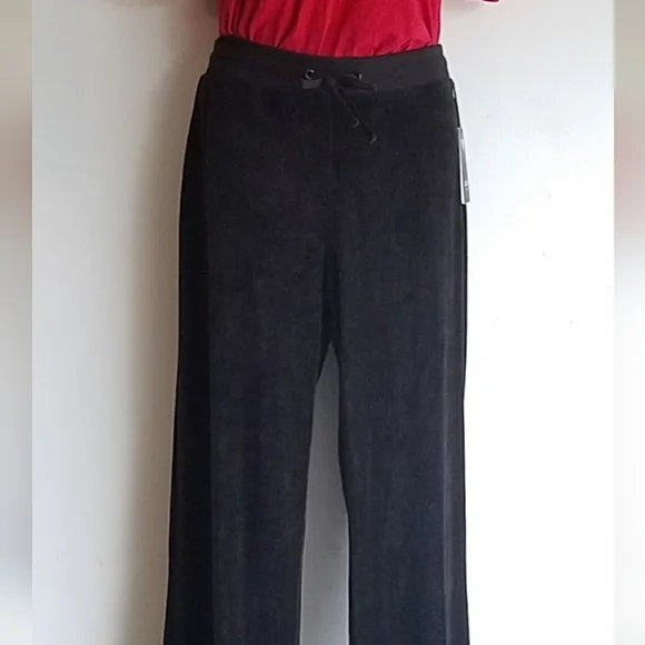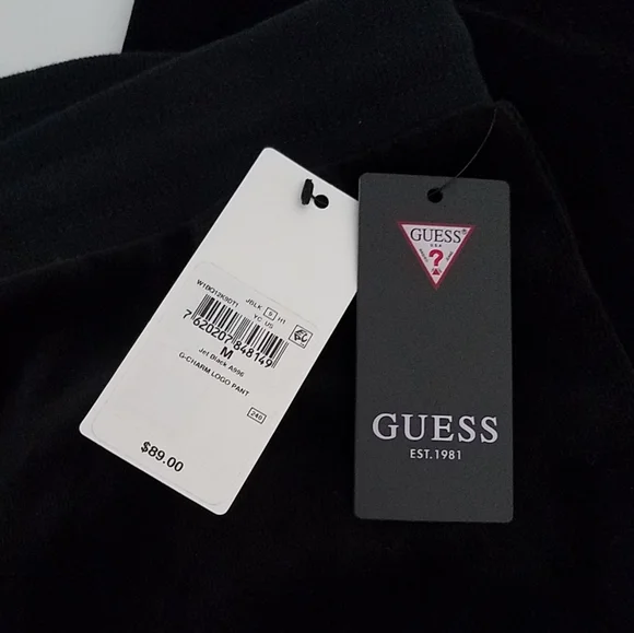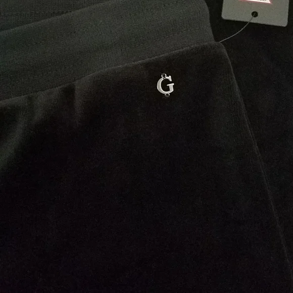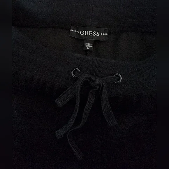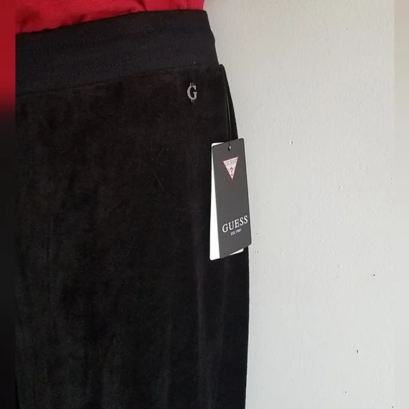A drawstring pant from Guess thatfeatures an easy laid back pull on finishenhanced with eye catching detail, adazzling logo charm at the front and soft lush material for a modern chic look. Size M. Color Black. "G" Charm on left front hip. Approx 1.75" wide elasticized waistband with drawstring. Cotton/Poly. Relaxed straight fit. Approx 33" Inseam. 10.25" front rise. Machine washable. New with tags.