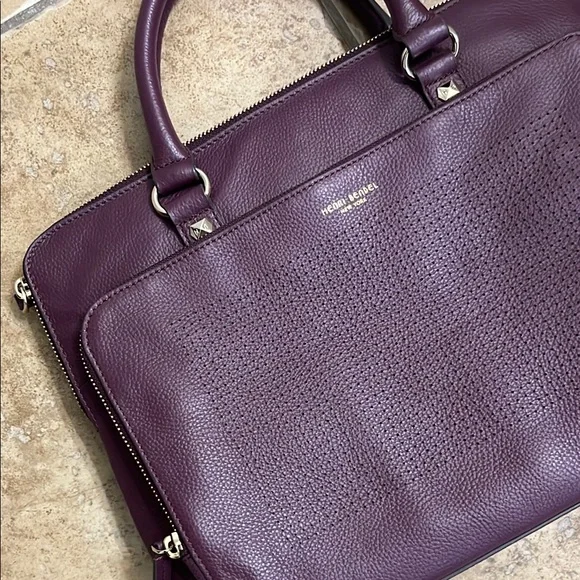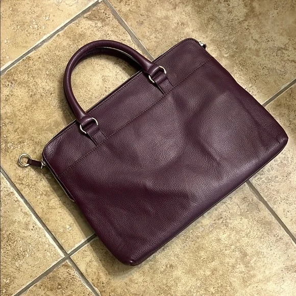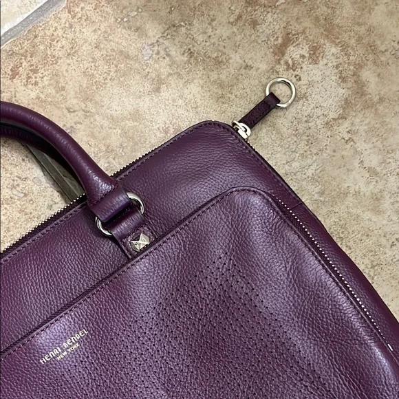This Henri Bendel laptop bag combines vibrant red and rich brown colors for a stylish look. Designed for functionality, it offers ample space to securely carry your laptop and essentials while maintaining a chic appearance.Inside zip pocketTwo outer pockets Comes with cross strap tooBag dimensions 13x2 1/2 x 10 1/2 approximately 12x8 outer front zip pocket Back slip pocket is length of bag Double zip top