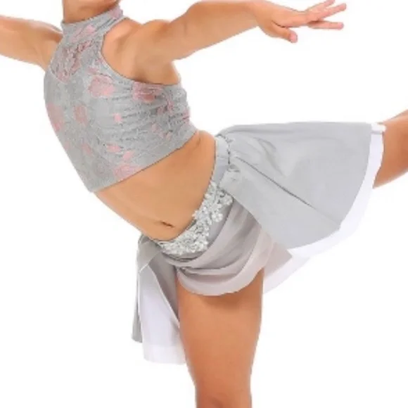 Grey, pink and white with lace, and a little sparkle on the waist, 2 piece, halterTop and skirt. Beautiful color and detail, another favorite!