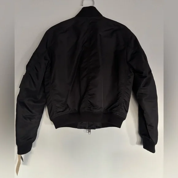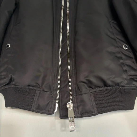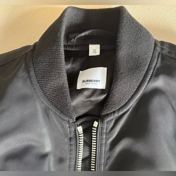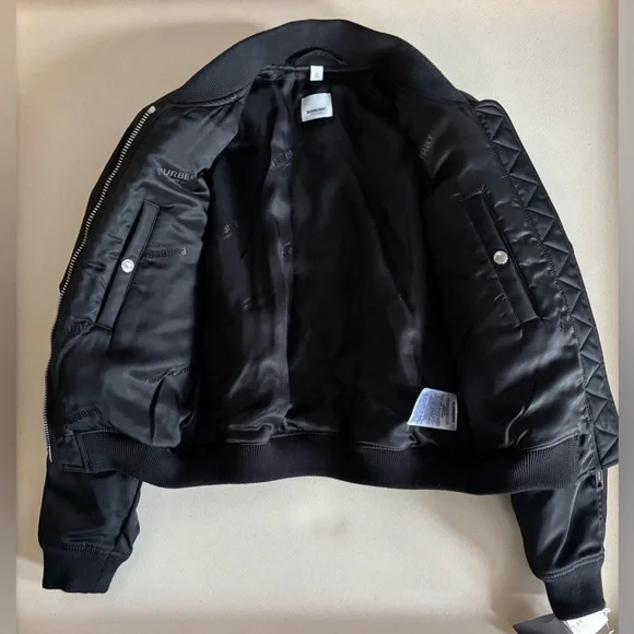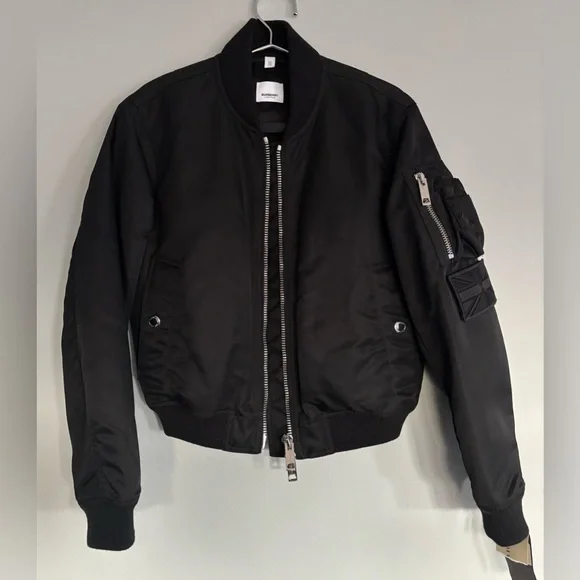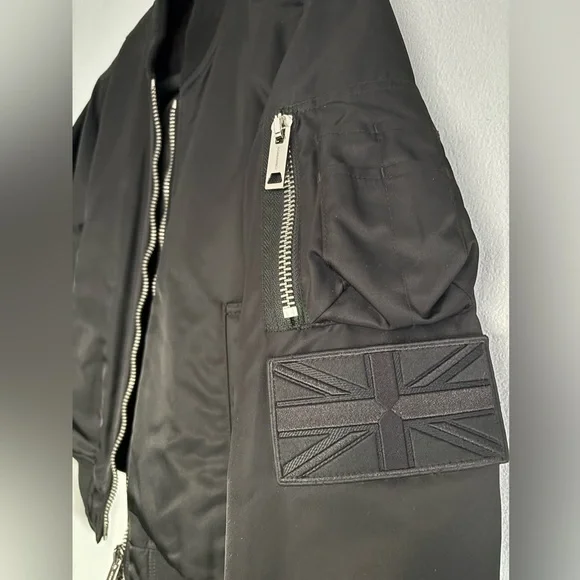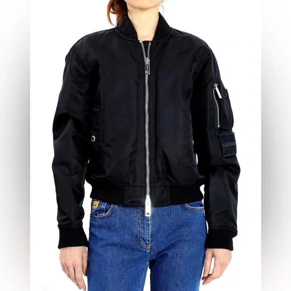 Burberry ladies Union Jack motif nylon bomber jacket in black. This jacket features a detachable patch applique embroidered with a union jack motif, zip closure, press-stud welt pockets, zip and pen pocket at sleeve and interior press-stud welt pockets. Outer: 100% polyamide. SKU: 8010821 Conditions: NEW