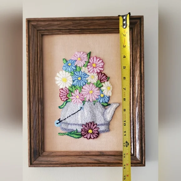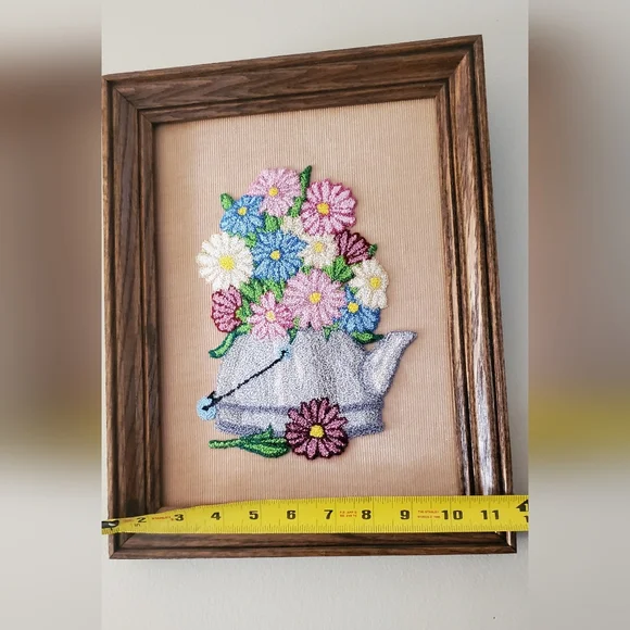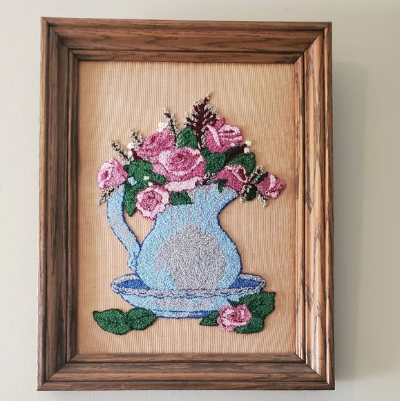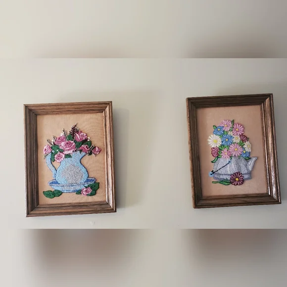 I've never seen a set like this one! Two detailed, skillfully punched embroideries on a taupe corduroy background. Lovely coordinating scenes in blue, pink, mauve, cream and gray. One is a blue pitcher with a floral arrangement, the other a tea kettle brimming with flowers. These pieces are a great size - each matching wooden frame measures 11.5" × 14". Whatever it is that draws you to these(handiwork, fiber art, floral, colorway, vintage esthetic)...I love them all and so will you! These pieces would be perfect anywhere: on a gallery wall, in a kitchen or vintage-inspired nursery. Brighten up your space with these vintage beauties!