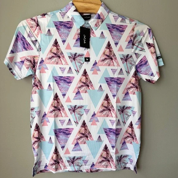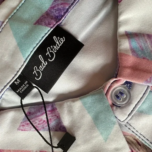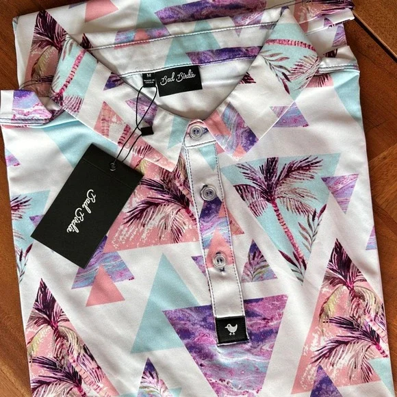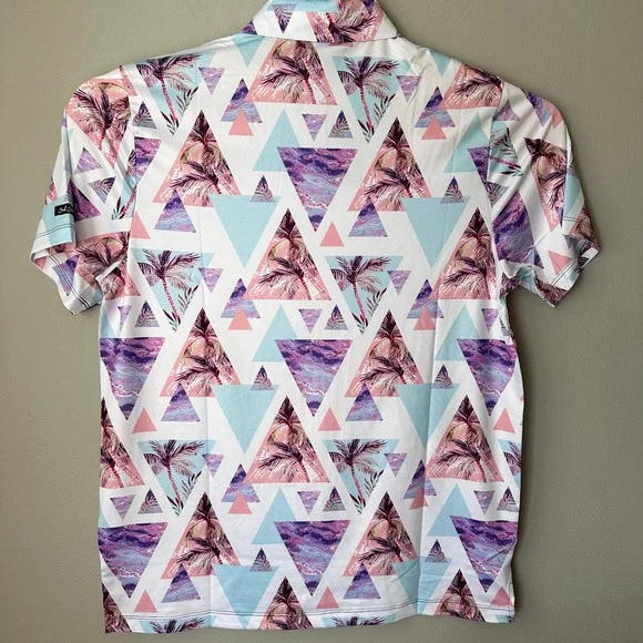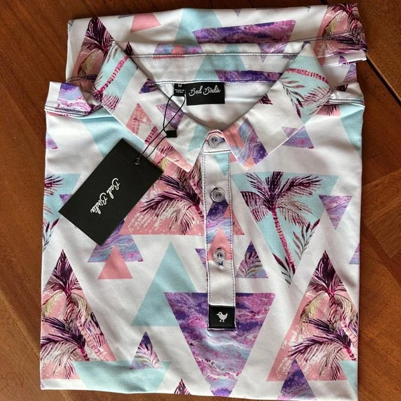 Bad Birdie Men Polo Shirt Medium Pastel Golf Geometric Palm Print Short SleeveThis stylish polo is designed for both performance and comfort on and off the golf course. The shirt features a collared neckline with a button closure, and short sleeves with a clean hem. Lightweight and breathable poly spandex blend.New. Never worn. Flat lay measurementsPit to pit 20"Length 27"
